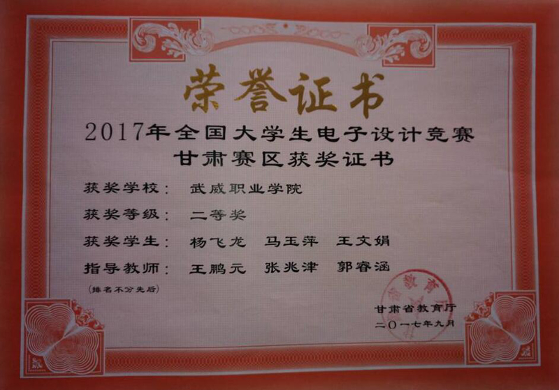 近日,2017年全國大學(xué)生電子設(shè)計競賽甘肅賽區(qū)成績揭曉。由電子信息工程系2016級應(yīng)用電子技術(shù)專業(yè)楊飛龍、馬玉萍、王文娟3名同學(xué)組成的團隊在我系王鵬元、張兆津、郭睿涵3名教師指導(dǎo)下榮獲甘肅賽區(qū)二等獎。此次獲獎也是我系在優(yōu)質(zhì)校建設(shè)中狠抓教學(xué)科研和學(xué)生技能培養(yǎng)方面取得的豐碩成果。
