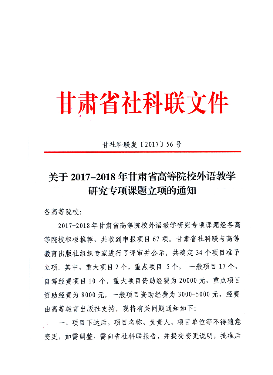 轉(zhuǎn)發(fā)甘肅省社科聯(lián)“關(guān)于2017-2018年甘肅省高等院校外語(yǔ)教學(xué)研究專項(xiàng)課題立項(xiàng)的通知”