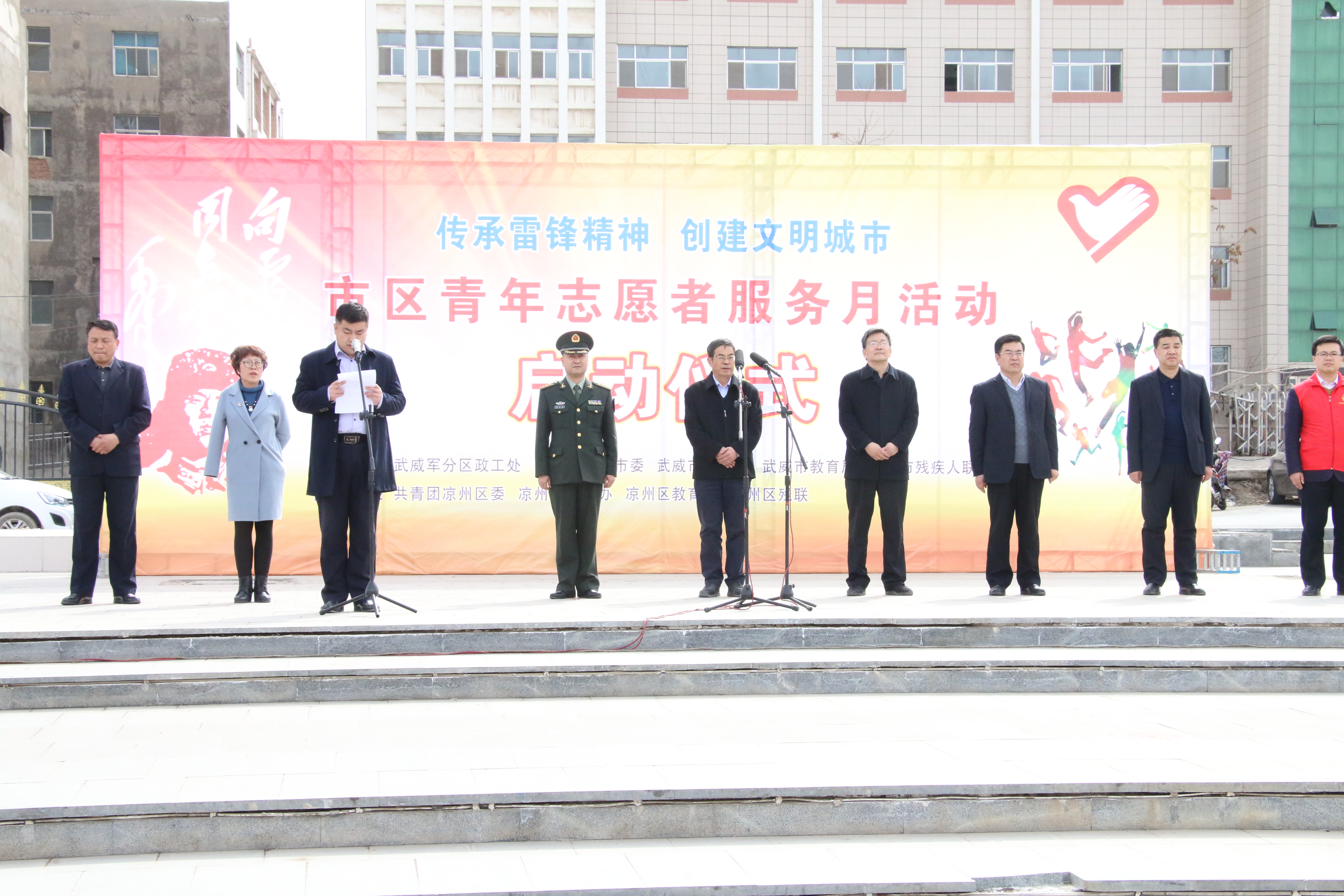 今年是毛澤東等老一輩革命家為雷鋒同志題詞55周年,3月5日是中國(guó)青年志愿者服務(wù)日。 3月5日下午,學(xué)院50名志愿者在武威市文化廣場(chǎng)參加了全市志愿者服務(wù)月活動(dòng)啟動(dòng)儀式,活動(dòng)現(xiàn)場(chǎng)氣氛熱烈,市領(lǐng)導(dǎo)為我院志愿服務(wù)隊(duì)進(jìn)行了授旗,青年志愿者代表宣讀了倡議書,全體志愿者重溫了青年志愿者誓詞。