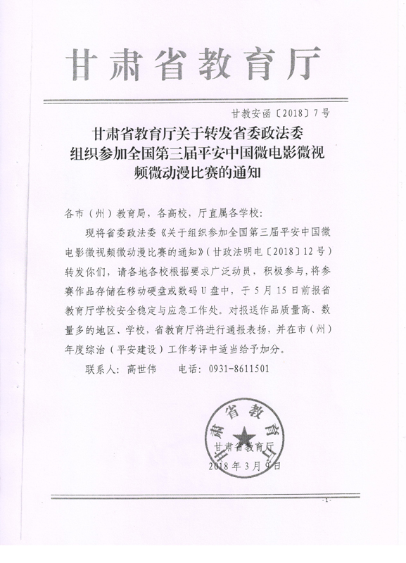 現(xiàn)將甘肅省教育廳關(guān)于轉(zhuǎn)發(fā)《省委政法委<關(guān)于組織參加全國第三屆平安中國微電影微視頻微動漫比賽的通知>》(甘政法明電〔2018〕12號)轉(zhuǎn)發(fā)你們,請各部門、單位根據(jù)要求廣泛動員,積極參與。將參賽作品存儲在移動硬盤或數(shù)碼U盤中,于5月10日前報宣傳統(tǒng)戰(zhàn)部辦公室,宣傳統(tǒng)戰(zhàn)部對報送作品匯總后統(tǒng)一報送省教育廳。
