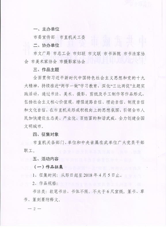 現(xiàn)將中共武威市委宣傳部、中共武威市直屬機(jī)關(guān)工作委員會(huì)《關(guān)于舉辦市直機(jī)關(guān)“不忘初心? 牢記使命”藝術(shù)作品展的通知》(武市直發(fā)〔2018〕9號(hào))轉(zhuǎn)發(fā)你們,請(qǐng)各部門(mén)、單位根據(jù)要求認(rèn)真組織,積極參與。將參賽作品于4月2日前報(bào)宣傳統(tǒng)戰(zhàn)部辦公室,宣傳統(tǒng)戰(zhàn)部對(duì)報(bào)送作品匯總后統(tǒng)一報(bào)送市直屬機(jī)關(guān)工委。