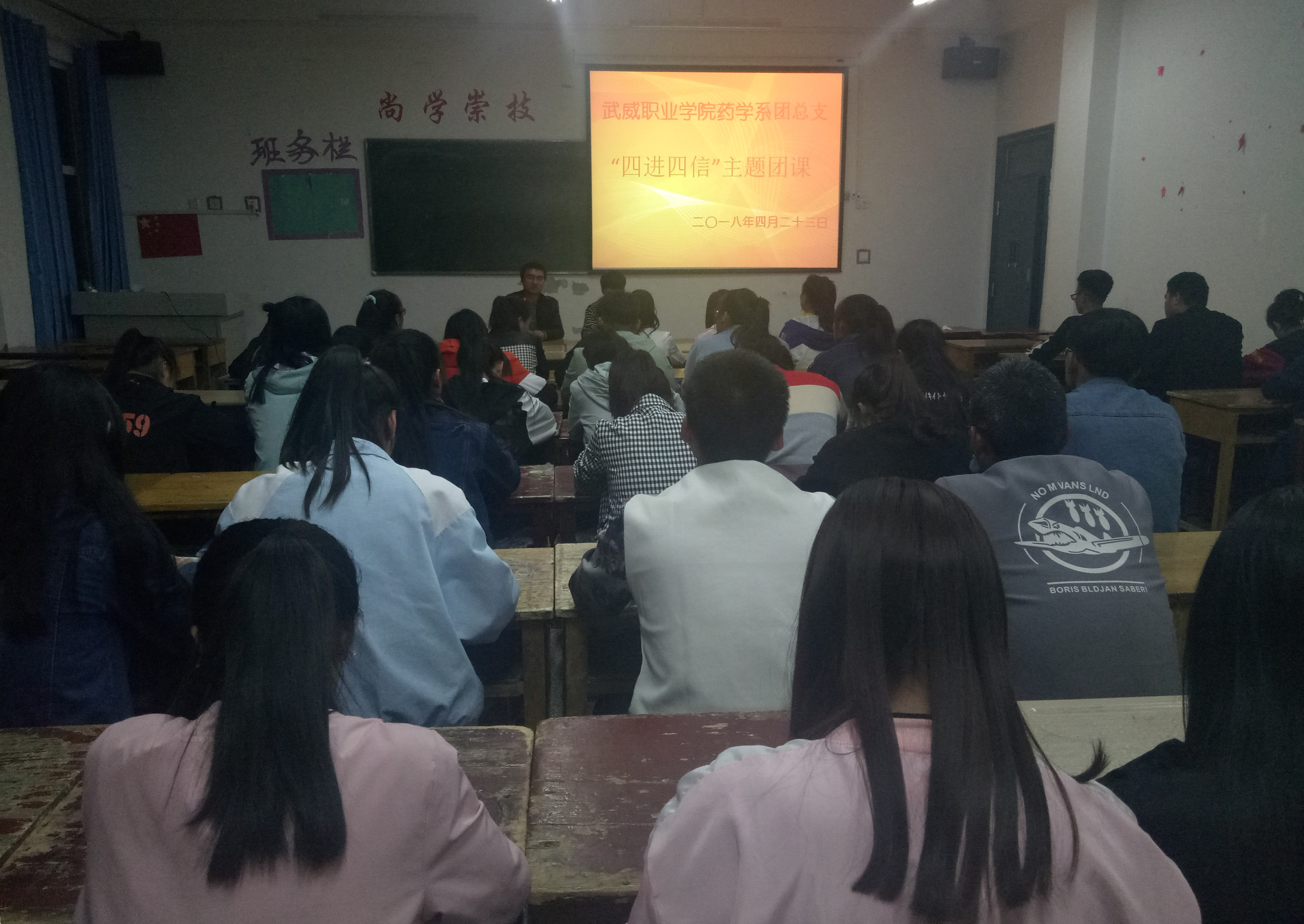 為深入學(xué)習(xí)宣傳貫徹習(xí)近平新時代中國特色社會主義思想,堅持以習(xí)近平新時代中國特色社會主義思想武裝團員干部和團員青年學(xué)生頭腦,積極推進各項工作開展。2018年4月23日晚,藥學(xué)系團總支組織16級團員青年及17級入團積極分子在明遠樓501教室開展關(guān)于“四進四信”的主題團課活動,團課由要藥學(xué)系團總支書記陳輝生主持。