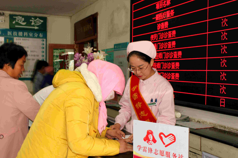 學(xué)雷鋒志愿服務(wù)站工作人員主要由年輕護(hù)士們擔(dān)任。她們身著護(hù)士裝,佩戴印有“學(xué)雷鋒志愿者服務(wù)”字樣綬帶,主動(dòng)為患者服務(wù)。志愿者們提供的主要服務(wù)項(xiàng)目有:在門診為老、弱、病、殘、孕等患者提供輪椅擔(dān)架租借。為患者提供開(kāi)水、就醫(yī)導(dǎo)診、戒煙勸導(dǎo)、醫(yī)學(xué)人文關(guān)懷、慢性病知識(shí)普及和健康宣教等便民利民服務(wù),受到了患者及家屬的一致好評(píng)。