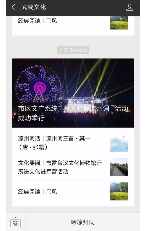 1.打開“武威文化”公眾號(hào),點(diǎn)擊最下方“吟涼州詞”進(jìn)入活動(dòng)“萬(wàn)人吟誦涼州詞”活動(dòng)頁(yè)面。