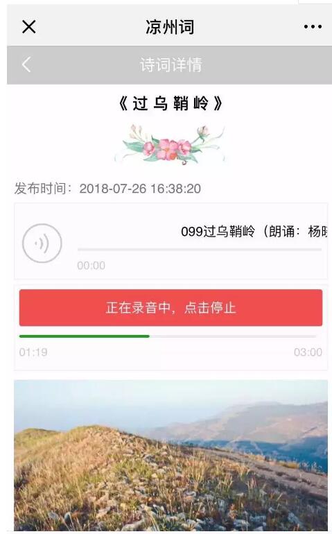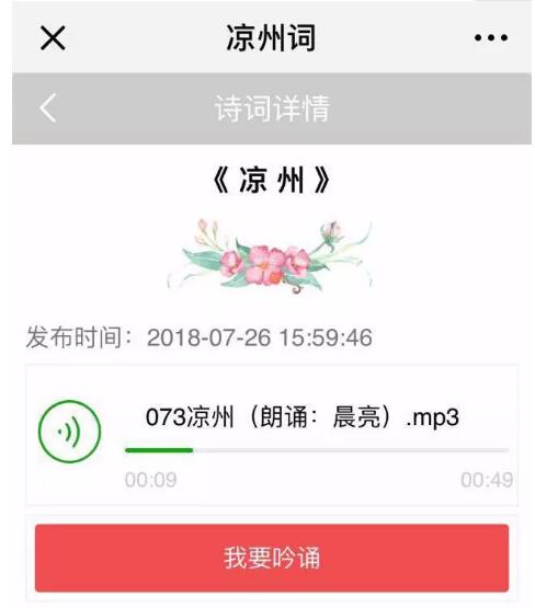 2.單擊自己選定的條目或詩(shī)詞名即可進(jìn)入吟誦頁(yè)面,點(diǎn)擊”我要吟誦”開始錄入音頻,?吟誦結(jié)束后點(diǎn)擊提交,保存音頻資料即可完成吟誦,已保存的詩(shī)詞音頻可在“我的吟誦”列表查看。