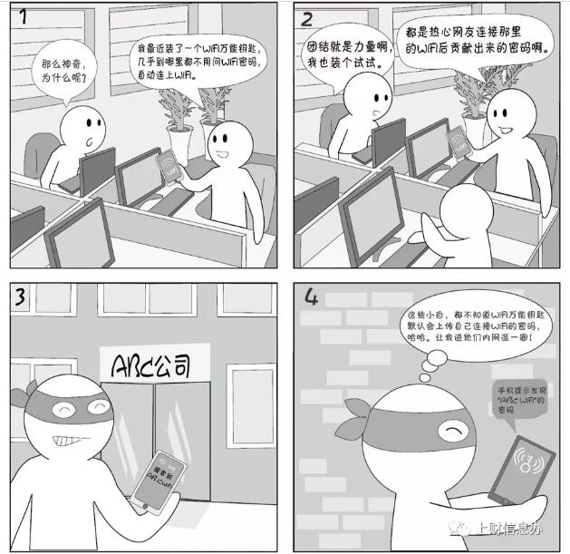 手機上的WIFI萬能鑰匙類的APP在安裝后默認設置會自動上傳你所連接的WIFI的密碼。這些密碼一般不會明文給出,只會在連接WIFI時自動輸入,但曾爆出漏洞用一個APP能讀出檢測到WIFI的密碼,這樣就可以用筆記本接入WIFI使用更強大的攻擊工具了。