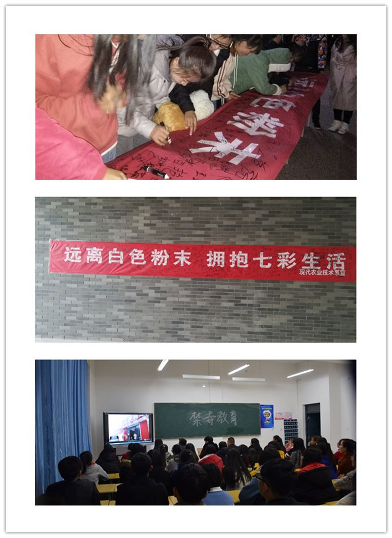 現(xiàn)代農(nóng)業(yè)技術(shù)系結(jié)合自身實(shí)際和條件,重點(diǎn)開展了以下活動(dòng)。一是通過在行樹樓張貼“遠(yuǎn)離白色粉末擁抱七彩生活”禁毒橫幅,號召全系師生創(chuàng)建和諧、文明、無毒的校園環(huán)境;二是各班開展了禁毒宣傳主題班會(huì),宣傳毒品危害,普及防毒知識,警示大家珍愛生命,遠(yuǎn)離毒品;三是組織學(xué)生參加學(xué)院禁毒征文大賽,用語言表達(dá)禁毒的決心;四是團(tuán)學(xué)會(huì)組織各班同學(xué)網(wǎng)上參觀“中國禁毒數(shù)字展覽館”,觀看禁毒題材的優(yōu)秀微電影《一路有你》、《少年的秘密》、《蛻變》、《愛心帶你回家》,讓在場同學(xué)深刻感受到毒品的危害,堅(jiān)定了同學(xué)們禁毒防毒的信心。