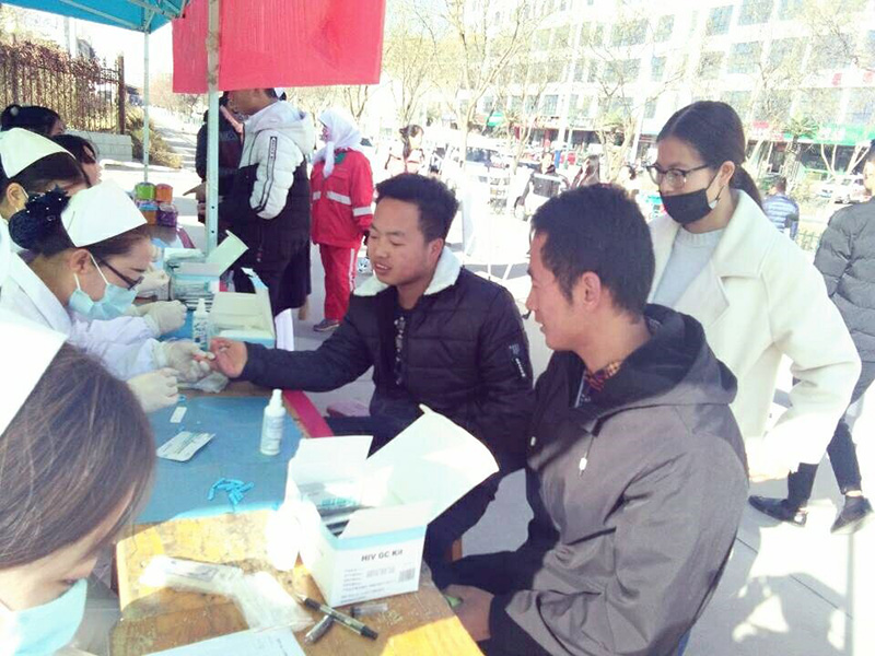 11月17日開始利用周末時間在武威文化廣場、武威職業(yè)學院門口等地開展了免費檢測艾滋病與知艾防艾知識宣傳活動。活動吸引了廣大師生及路人,組織井然有序,活動場面顯得忙而不亂。在護理系紅絲帶協(xié)會志愿者與武威市疾控中心人員嫻熟的操作下,通過指尖采血,HIV病毒膠體金法檢測,共檢測了80余人,檢測速度快,精準度高。檢測結束后,向檢測者贈送活動宣傳紀念品。此次檢測活動采取保密制,保護檢測者的一切信息。
