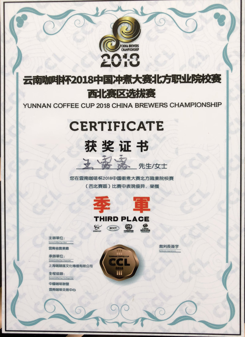 我院學生榮獲“云南咖啡杯2018中國沖煮大賽北方職業(yè)院校賽西北賽區(qū)選拔賽”季軍
