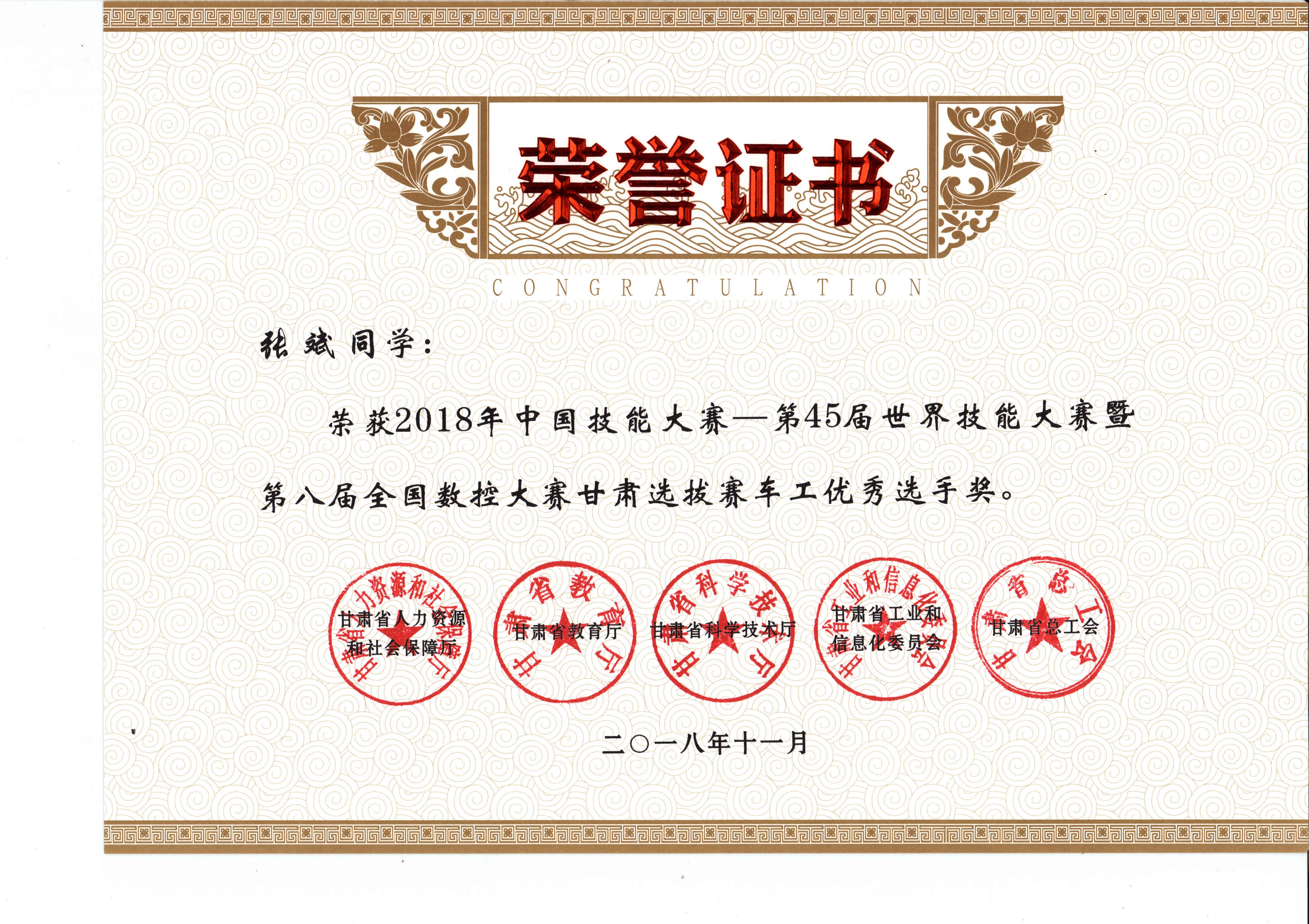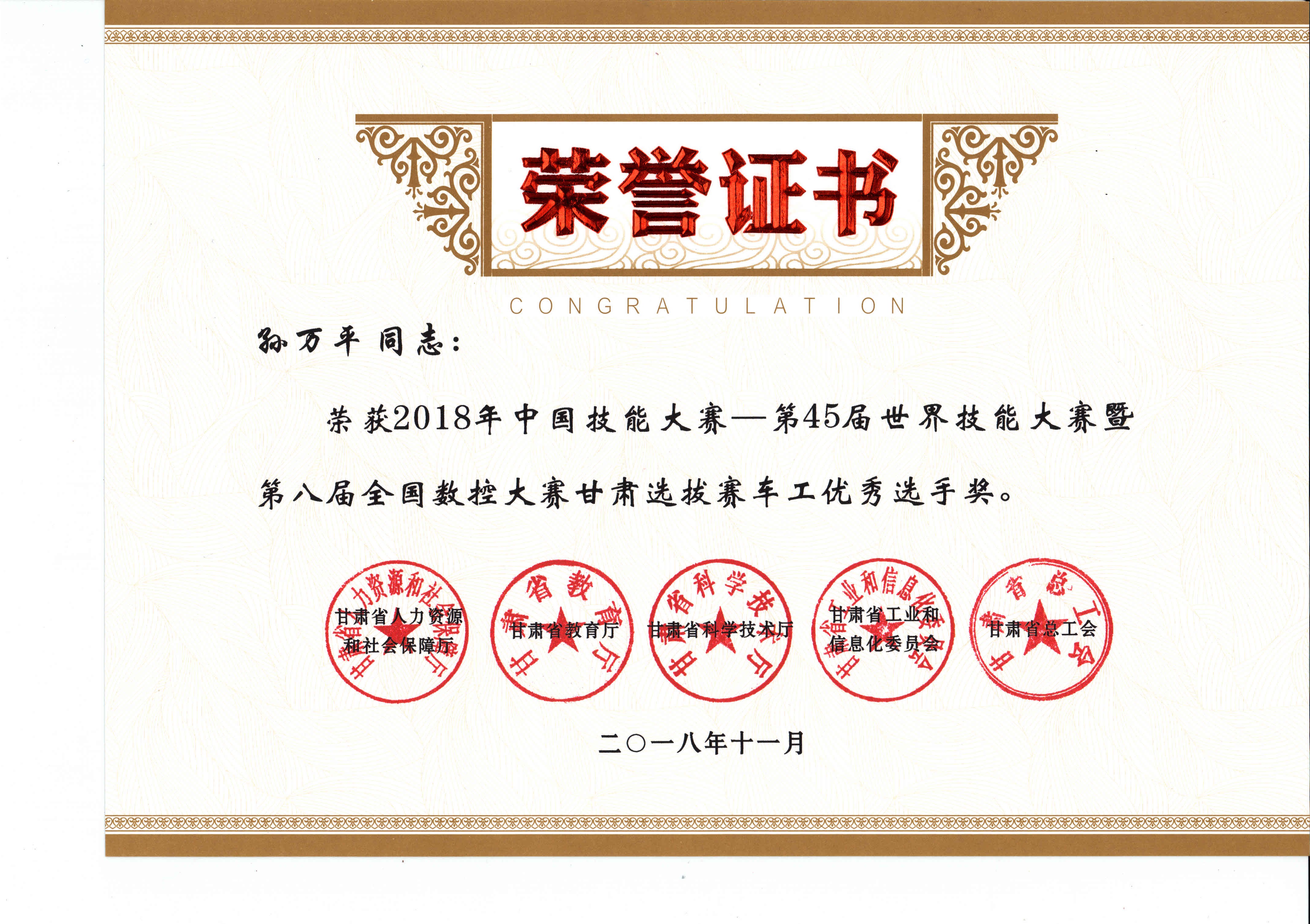 2018年中國技能大賽--第45屆世界技能大賽暨第八屆全國數(shù)控大賽甘肅選拔賽(車工項目)獲獎證書