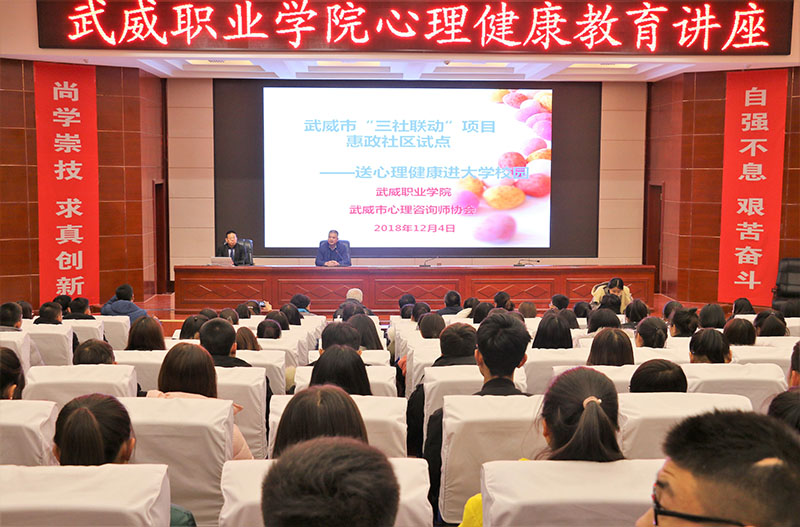 12月4日晚上,學(xué)生工作處聯(lián)合武威市“三社聯(lián)動(dòng)”惠政社區(qū)試點(diǎn)項(xiàng)目在學(xué)院菁英廳舉辦了心理健康專題講座暨心理信息員培訓(xùn)。此次講座邀請(qǐng)武威市心理咨詢師協(xié)會(huì)會(huì)長何飛老師主講,學(xué)院各系輔導(dǎo)員、2017級(jí)、2018級(jí)班級(jí)心理信息員、心翼心理社團(tuán)會(huì)員等220多人聆聽了講座。學(xué)生工作處處長王守云主持活動(dòng)。