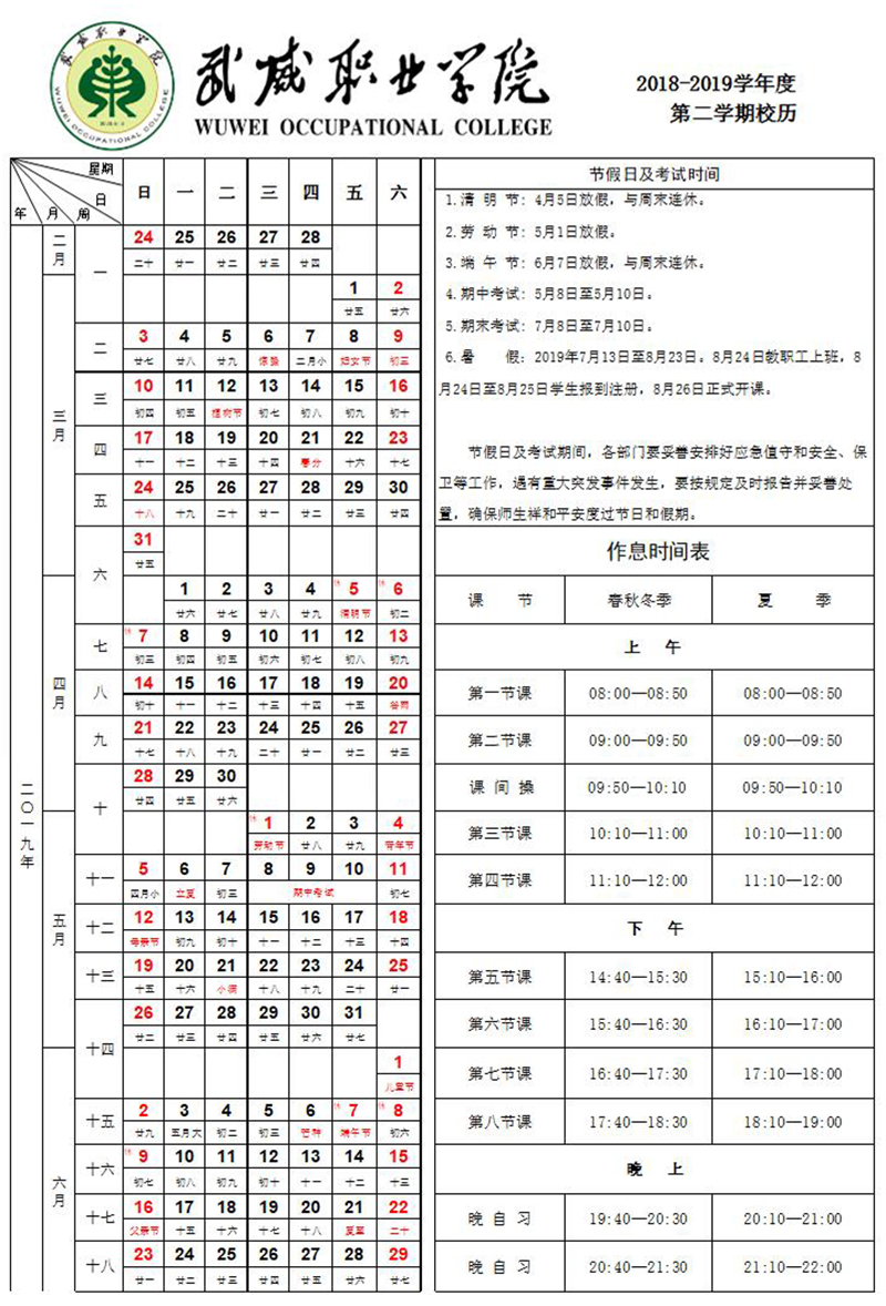 2018-2019學年度第2學期校歷