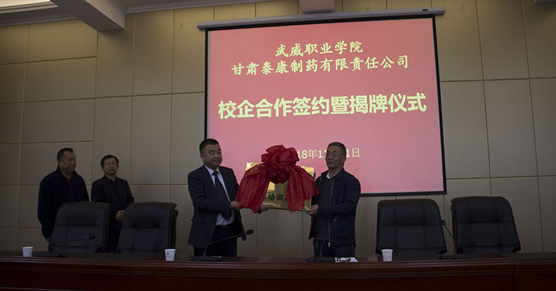 為提高人才培養(yǎng)質(zhì)量和辦學(xué)水平,加強(qiáng)校企協(xié)同育人機(jī)制建設(shè),2018年11月1日下午,藥學(xué)系與甘肅泰康制藥有限責(zé)任公司校企合作共建“就業(yè)實(shí)習(xí)基地”簽約揭牌儀式在行樹(shù)樓北側(cè)會(huì)議室隆重舉行。甘肅泰康制藥有限責(zé)任公司投資方—北京久朝集團(tuán)產(chǎn)業(yè)中心總監(jiān)楊宏超、公司總工程師毛著鴻、財(cái)務(wù)總監(jiān)郝敏等企業(yè)領(lǐng)導(dǎo)出席本次儀式。學(xué)院教務(wù)處處長(zhǎng)仲生仁、招生就業(yè)處處長(zhǎng)蔡柱山、藥學(xué)系主任魏潤(rùn)明、副主任楊建美、黨總支副書(shū)記單光年及藥學(xué)系160余名師生參加了此次簽約揭牌儀式。儀式由魏潤(rùn)明主持。