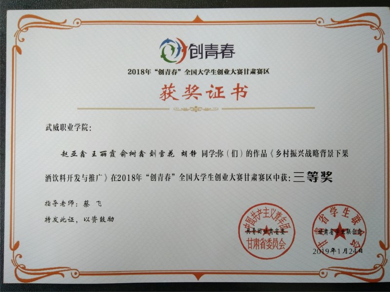 現(xiàn)代農(nóng)業(yè)技術(shù)系兩件作品獲得2018年“創(chuàng)青春”全國大學生創(chuàng)業(yè)大賽甘肅賽區(qū)三等獎