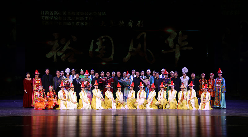 大型歌舞劇《裕固風(fēng)華》是河西學(xué)院師生歷經(jīng)三年精心打造的首部原創(chuàng)教學(xué)劇目,是教育部、文化和旅游部、財(cái)政部高雅藝術(shù)進(jìn)校園活動省級巡演劇目,是省委宣傳部和省文旅廳“春綠隴原”展演劇目,是甘肅省學(xué)校美育改革與發(fā)展重大項(xiàng)目、甘肅省高校美育教育舞臺示范精品。全劇由《序》《東遷》《家園》《傳說》《婚禮》五個篇章組成,以裕固族傳統(tǒng)民歌、舞蹈、民俗為載體進(jìn)行創(chuàng)作和改編,以情景歌舞的形式表現(xiàn)裕固族的歷史變遷和民俗文化,以講述、吟誦、歌舞的手法,再現(xiàn)了裕固族的發(fā)展歷史和多姿多彩的獨(dú)特文化,以高品位的藝術(shù)水準(zhǔn)弘揚(yáng)、展現(xiàn)了中華民族傳統(tǒng)文化的優(yōu)良基因和時代活力。