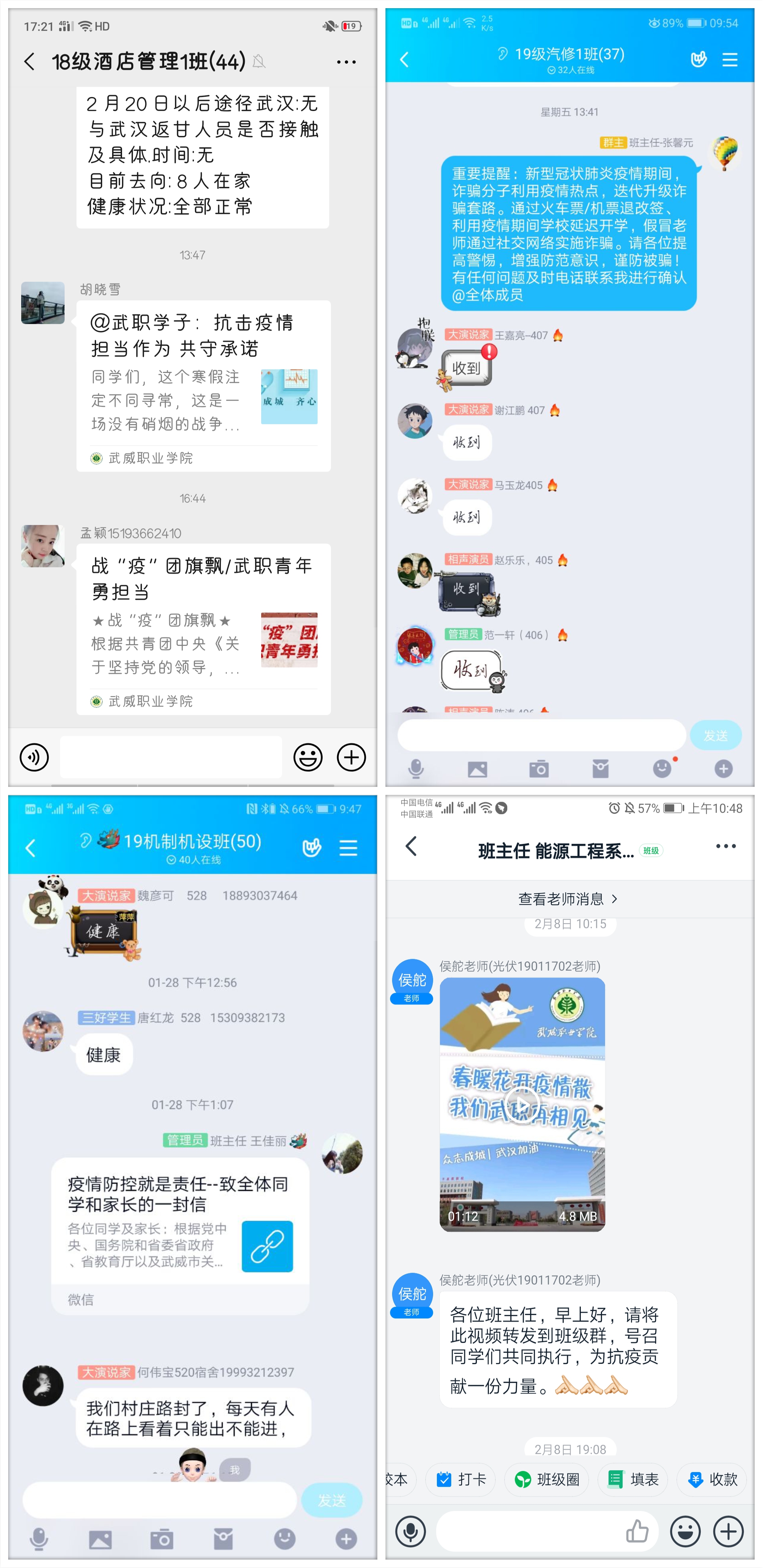 學(xué)生工作處及時(shí)發(fā)布了致學(xué)生和家長(zhǎng)的一封信《疫情防控就是責(zé)任》,團(tuán)委制作和推送了《春暖花開(kāi)疫情散 我們武職再相見(jiàn)》溫馨提示短片和《@武職學(xué)子:抗擊疫情 擔(dān)當(dāng)作為 共守承諾》倡議,用生動(dòng)形象的表述要求和提醒同學(xué)們不得提前返校,做好個(gè)人防護(hù)措施,遵守當(dāng)?shù)匾咔榉揽馗黜?xiàng)要求,做到不信謠不傳謠,及時(shí)向?qū)W院報(bào)送個(gè)人防疫相關(guān)信息,不瞞報(bào)不慌報(bào)。各院系輔導(dǎo)員和班主任都會(huì)第一時(shí)間在學(xué)生群里轉(zhuǎn)發(fā),同時(shí)把學(xué)院網(wǎng)站和微信平臺(tái)上科學(xué)的防控知識(shí)和上級(jí)的有關(guān)精神及時(shí)傳達(dá)給學(xué)生,當(dāng)好疫情防控的宣傳員,做到戰(zhàn)疫有“力”。