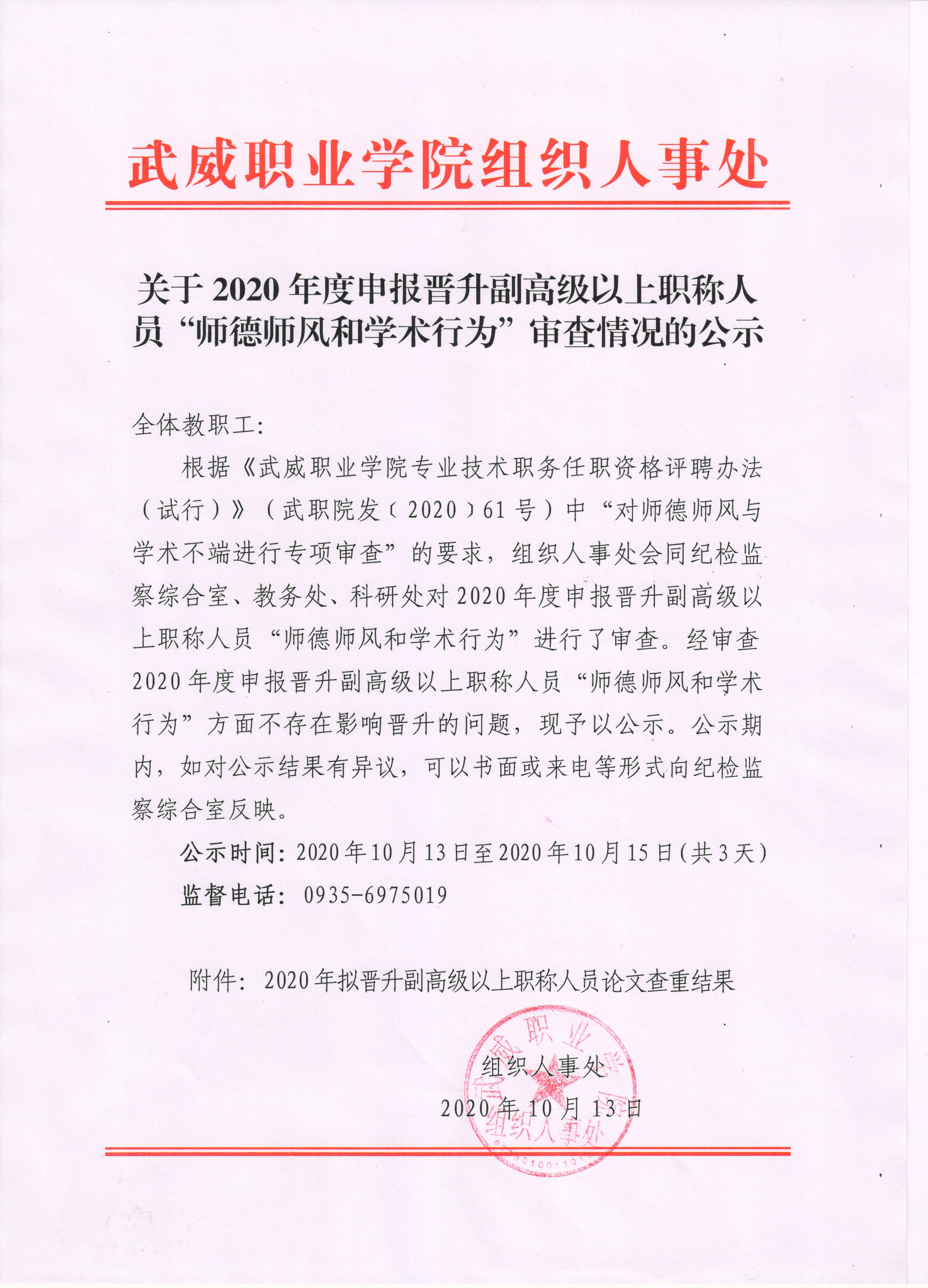 關(guān)于2020年度申報(bào)晉升副高級(jí)以上職稱(chēng)人員“師德師風(fēng)和學(xué)術(shù)行為”審查情況的公示