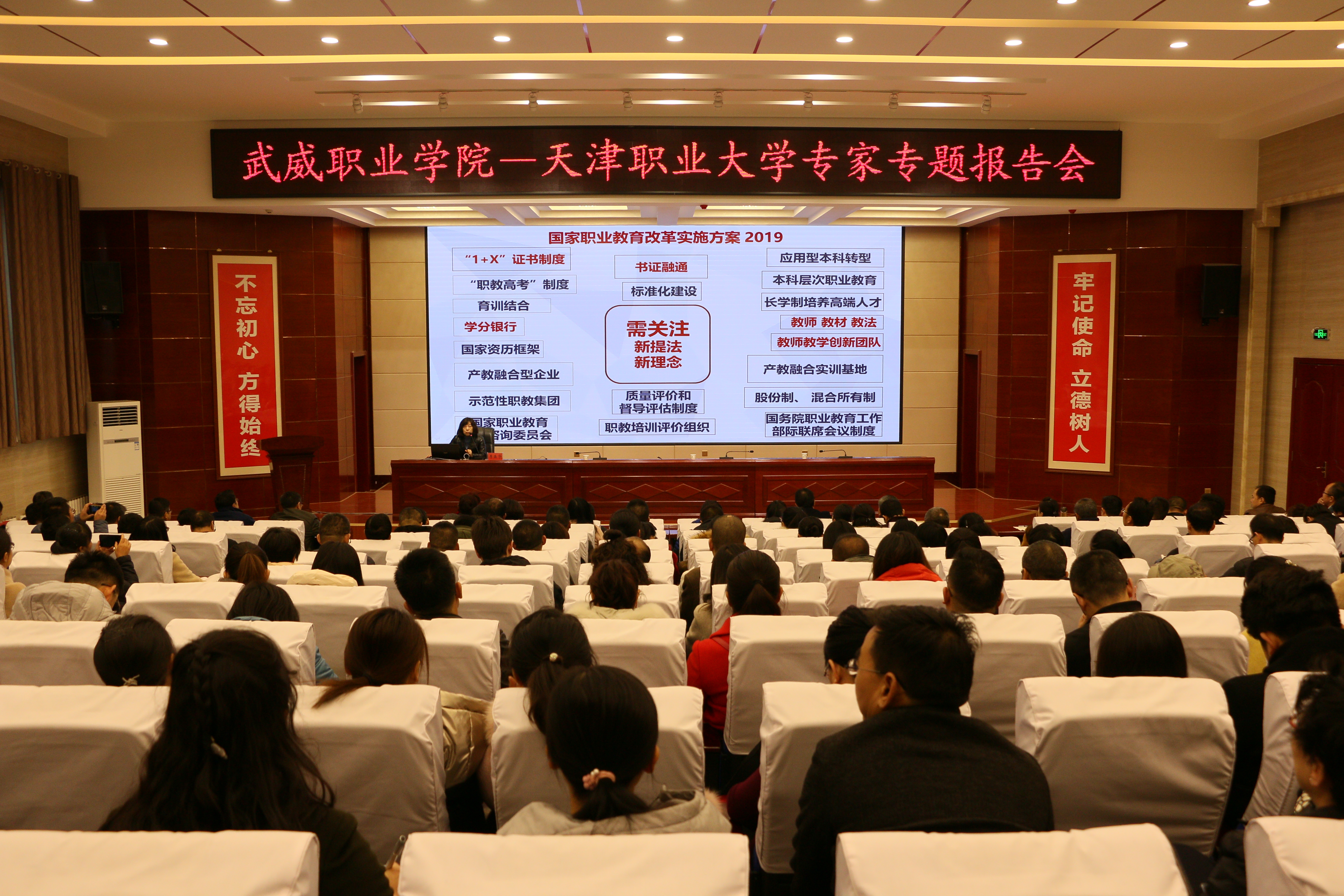 11月20日,武威職業(yè)學(xué)院“綠洲講壇”第27期在學(xué)院菁英廳舉行,本期活動(dòng)邀請(qǐng)到天津職業(yè)大學(xué)汽車(chē)學(xué)院院長(zhǎng)李晶華作主題為“《國(guó)家職業(yè)教育改革實(shí)施方案》解讀”的報(bào)告。學(xué)院領(lǐng)導(dǎo)班子、中層干部、教師代表220余人參加了報(bào)告會(huì)。本期講壇由學(xué)院黨委書(shū)記、院長(zhǎng)趙明主持。
