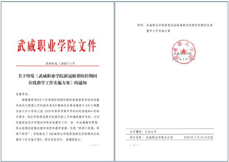 1月27日,學(xué)院新型冠狀病毒感染肺炎疫情聯(lián)防聯(lián)控工作領(lǐng)導(dǎo)小組召開(kāi)會(huì)議,決定從1月28日開(kāi)始停止學(xué)院一切線下教學(xué)活動(dòng),并組織擬訂學(xué)院在線教學(xué)工作方案。2月4日,學(xué)院初步制定完成《武威職業(yè)學(xué)院新型冠狀病毒肺炎疫情防控期間在線教學(xué)工作實(shí)施方案》并面向全院征求意見(jiàn),同時(shí)要求各教學(xué)系積極謀劃、科學(xué)論證,制定各系在線教學(xué)工作實(shí)施方案。2月8日-14日,教務(wù)處陸續(xù)向各教學(xué)系推送教育部發(fā)布的各大教學(xué)平臺(tái)支持高校開(kāi)展在線教學(xué)服務(wù)方案,并篩選中國(guó)大學(xué)MOOC、人衛(wèi)慕課、超星慕課、學(xué)銀在線等教學(xué)平臺(tái)推出的課程資源供各系參考使用,同時(shí)指導(dǎo)各系做好課程在線教學(xué)計(jì)劃編制工作。