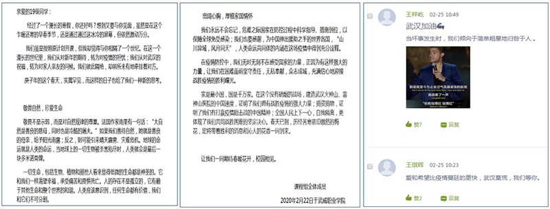 《中華優(yōu)秀傳統(tǒng)文化》課程團(tuán)隊(duì)的馮文娟老師在開(kāi)學(xué)第一天借助在線教學(xué)平臺(tái)向?qū)W生推送了《致2019級(jí)學(xué)生的一封信》,激勵(lì)學(xué)生要敬畏自然、珍愛(ài)生命,致敬英雄、感恩榜樣,寬闊心胸、厚植家國(guó)情懷。信中這樣寫(xiě)道:“在疫情防控中,我們無(wú)時(shí)無(wú)刻不在感受?chē)?guó)家的力量,正因?yàn)橛羞@樣強(qiáng)大的力量,讓我們?cè)诶щy面前堅(jiān)守責(zé)任,無(wú)私奉獻(xiàn),眾志成城,充滿信心地迎接戰(zhàn)勝疫情的勝利曙光?!薄?家是最小國(guó),國(guó)是千萬(wàn)家。在這個(gè)沒(méi)有硝煙的戰(zhàn)場(chǎng),建造武漢火神山、雷神山醫(yī)院的中國(guó)速度,證明了我們擁有戰(zhàn)勝疫情的強(qiáng)大力量;捐資捐物,證明了我們有打贏疫情阻擊戰(zhàn)的中國(guó)精神;全國(guó)人民上下一心,自我隔離,更體現(xiàn)了我們共同戰(zhàn)勝困難的堅(jiān)定決心。春天已到,歷經(jīng)苦寒依舊傲然的梅花,定將帶著勝利的消息和沁人的花香一同到來(lái)。”同時(shí),為學(xué)生推送由央視頻和有道精品課共同錄制的《面對(duì)疫情教你如何有效防范》疫情防控專題視頻,與學(xué)生一起為打贏新冠肺炎疫情防控阻擊戰(zhàn)貢獻(xiàn)力量。