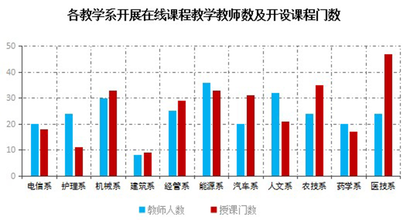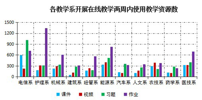 根據(jù)學(xué)院教學(xué)平臺(tái)管理數(shù)據(jù)和各教學(xué)系反饋數(shù)據(jù),開(kāi)課兩周內(nèi)全院開(kāi)展在線教學(xué)教師共有263人,開(kāi)設(shè)課程284門(mén);學(xué)院兩周內(nèi)授課課時(shí)總數(shù)達(dá)到1949學(xué)時(shí),教師開(kāi)展在線教學(xué)3334人次;發(fā)布作業(yè)共計(jì)1306次,組織答疑討論1918次。教師教學(xué)形式靈活多樣,對(duì)教學(xué)平臺(tái)及教學(xué)工具的熟練程度逐漸提升,教師討論交流的主題從基礎(chǔ)性的上傳資源、組織教學(xué)、組織教學(xué)等轉(zhuǎn)變?yōu)樽鳂I(yè)發(fā)布、主題討論、學(xué)情數(shù)據(jù)分析,在線教學(xué)工作步入正軌。