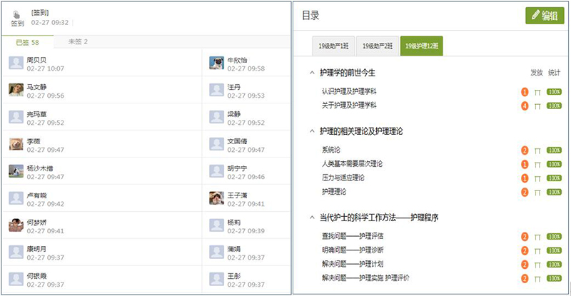 根據(jù)教學(xué)實(shí)際,護(hù)理制定了線上教學(xué)工作方案,對(duì)線上教學(xué)工作做出統(tǒng)一安排,強(qiáng)調(diào)了線上教學(xué)督導(dǎo)、任課教師和班主任的具體工作職責(zé)。2月24日,各項(xiàng)教學(xué)工作有序開(kāi)展。共24名教師完成 11門(mén)課程的在線教學(xué)任務(wù),主要依托學(xué)院在線教學(xué)平臺(tái)、中國(guó)大學(xué)MOOC、人衛(wèi)慕課、智慧職教平臺(tái)上完成授課,上課學(xué)生1510人。通過(guò)多層次多方位的監(jiān)控?cái)?shù)據(jù)分析,全系在線教學(xué)整體運(yùn)行平穩(wěn)有序,管理人員組織管理到位,教師盡職盡責(zé),課堂授課方式靈活多樣,學(xué)生積極互動(dòng),在線教學(xué)課堂效果良好,達(dá)到預(yù)期。學(xué)生平均到課率達(dá)到99%以上,積極落實(shí)了在線教學(xué)對(duì)學(xué)生“全覆蓋”的要求。教師在教學(xué)平臺(tái)上完成視頻、電子教材、PPT等資源上傳,積極開(kāi)展課前預(yù)習(xí)、主題討論、隨堂測(cè)驗(yàn)、作業(yè)布置等各類線上課堂教學(xué)活動(dòng),充分調(diào)動(dòng)學(xué)生的學(xué)習(xí)主動(dòng)性,學(xué)習(xí)效果良好。