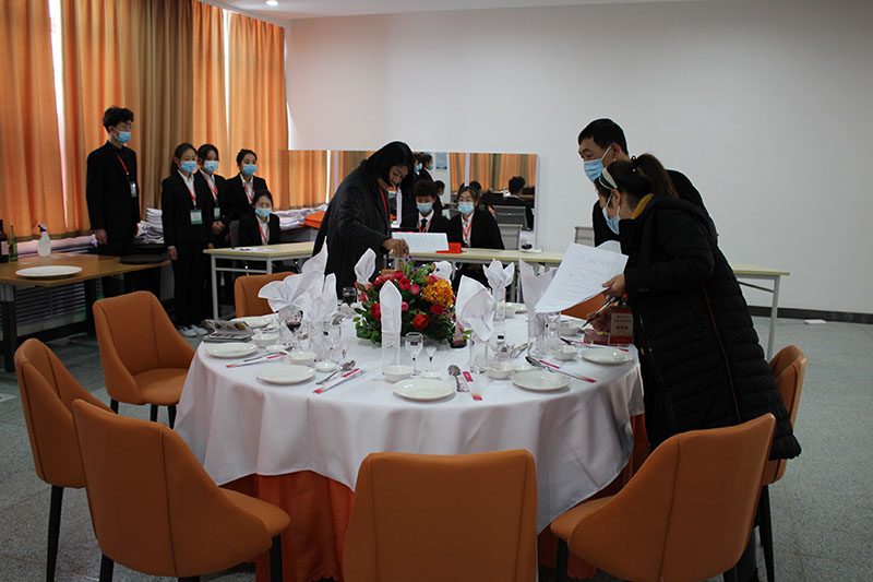 比賽分為四個(gè)賽段,當(dāng)天先進(jìn)行了第一賽段和第二賽段的角逐,來(lái)自涼州區(qū)職業(yè)中等專業(yè)學(xué)校、民勤縣職業(yè)中等專業(yè)學(xué)校、古浪縣職業(yè)技術(shù)教育中心的32位選手精神飽滿,同臺(tái)競(jìng)技。比賽現(xiàn)場(chǎng),客房中式鋪床、中餐宴會(huì)擺臺(tái)、英語(yǔ)口語(yǔ)口試三個(gè)項(xiàng)目同時(shí)進(jìn)行。開(kāi)單、拋單、定位、包角,套被罩……,在選手3分鐘緊張有序的操作中,一張張整潔、干凈的床面變戲法似的呈現(xiàn)大眾面前;餐碟定位,擺放講究,餐巾折花,美觀大方,精美的中餐宴會(huì)擺臺(tái)為觀眾帶來(lái)了獨(dú)特的審美感受;服務(wù)英語(yǔ)交際溝通發(fā)音標(biāo)準(zhǔn),流利清晰。選手們嫻熟的崗位操作技能、規(guī)范的操作程序、扎實(shí)的酒店服務(wù)英語(yǔ)功底、優(yōu)雅的儀容儀表給大家留下了美好的印象,也贏得了評(píng)委老師的贊許,每一位參賽者的作品都獨(dú)具創(chuàng)意、各具特色,比賽現(xiàn)場(chǎng)精彩紛呈,高潮不斷。來(lái)自政校企三方組成的評(píng)委團(tuán)對(duì)每一個(gè)細(xì)節(jié)都嚴(yán)格把控,大到抖單定位方法、托盤姿勢(shì),小到盤碟之間的距離也要使用卡尺細(xì)心丈量。在每輪比賽結(jié)束后,評(píng)委老師還向參賽選手悉心講授了各項(xiàng)目的前沿細(xì)節(jié)知識(shí),并演示了高超的操作技能。