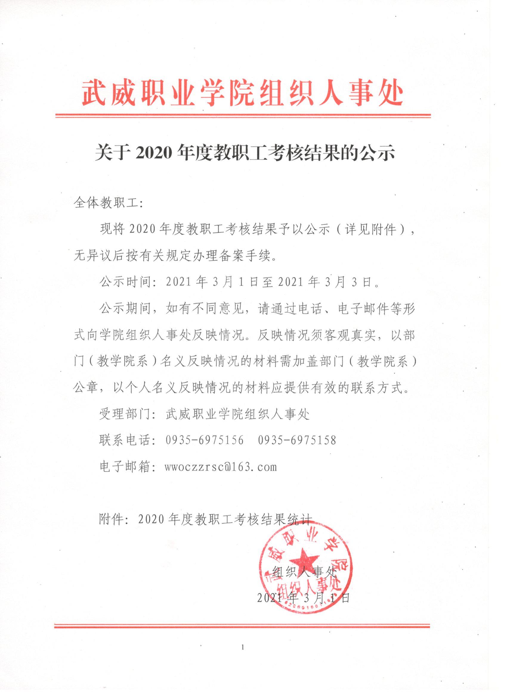 關于2020年度教職工考核結(jié)果的公示