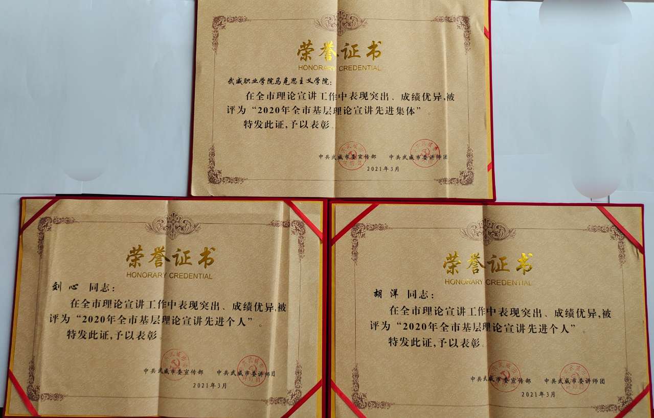 3月25日下午,武威市委宣傳部組織召開(kāi)了“黨史教育專題宣講動(dòng)員會(huì)暨2020年宣講工作先進(jìn)集體和個(gè)人表彰會(huì)”。武威職業(yè)學(xué)院馬克思主義學(xué)院被授予“2020年全市基層理論宣講先進(jìn)集體”榮譽(yù)稱號(hào),同時(shí)馬克思主義學(xué)院教師、翟存祥名師工作室成員劉心、胡洋被授予“2020年全市基層理論宣講先進(jìn)個(gè)人”榮譽(yù)稱號(hào)。