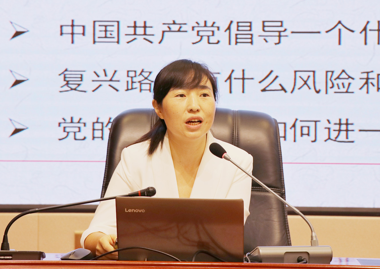 讀書班邀請(qǐng)市委黨史宣傳團(tuán)成員、甘肅畜牧工程職業(yè)技術(shù)學(xué)院副教授羅海燕同志作專題輔導(dǎo)報(bào)告。羅海燕同志從深刻把握習(xí)近平總書記“七一”重要講話的重大意義、深刻把握習(xí)近平總書記“七一”重要講話的豐富內(nèi)涵、學(xué)習(xí)貫徹落實(shí)“七一”講話精神三個(gè)方面,對(duì)習(xí)近平總書記在慶祝中國共產(chǎn)黨成立100周年大會(huì)上的重要講話進(jìn)行了解讀,報(bào)告主題鮮明、內(nèi)涵豐富,給參加讀書班的黨員干部和師生作了一場(chǎng)精彩的專題輔導(dǎo)。