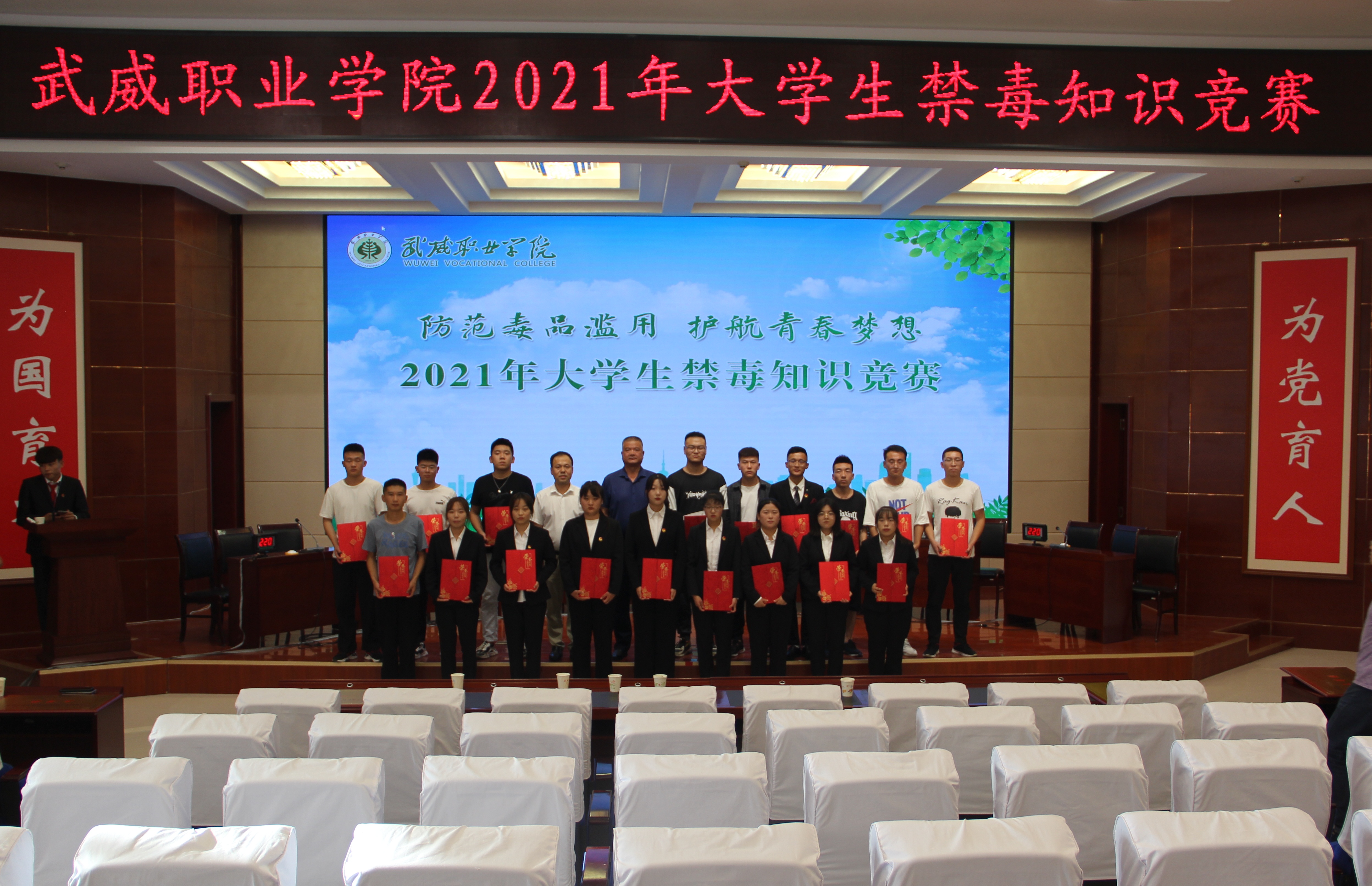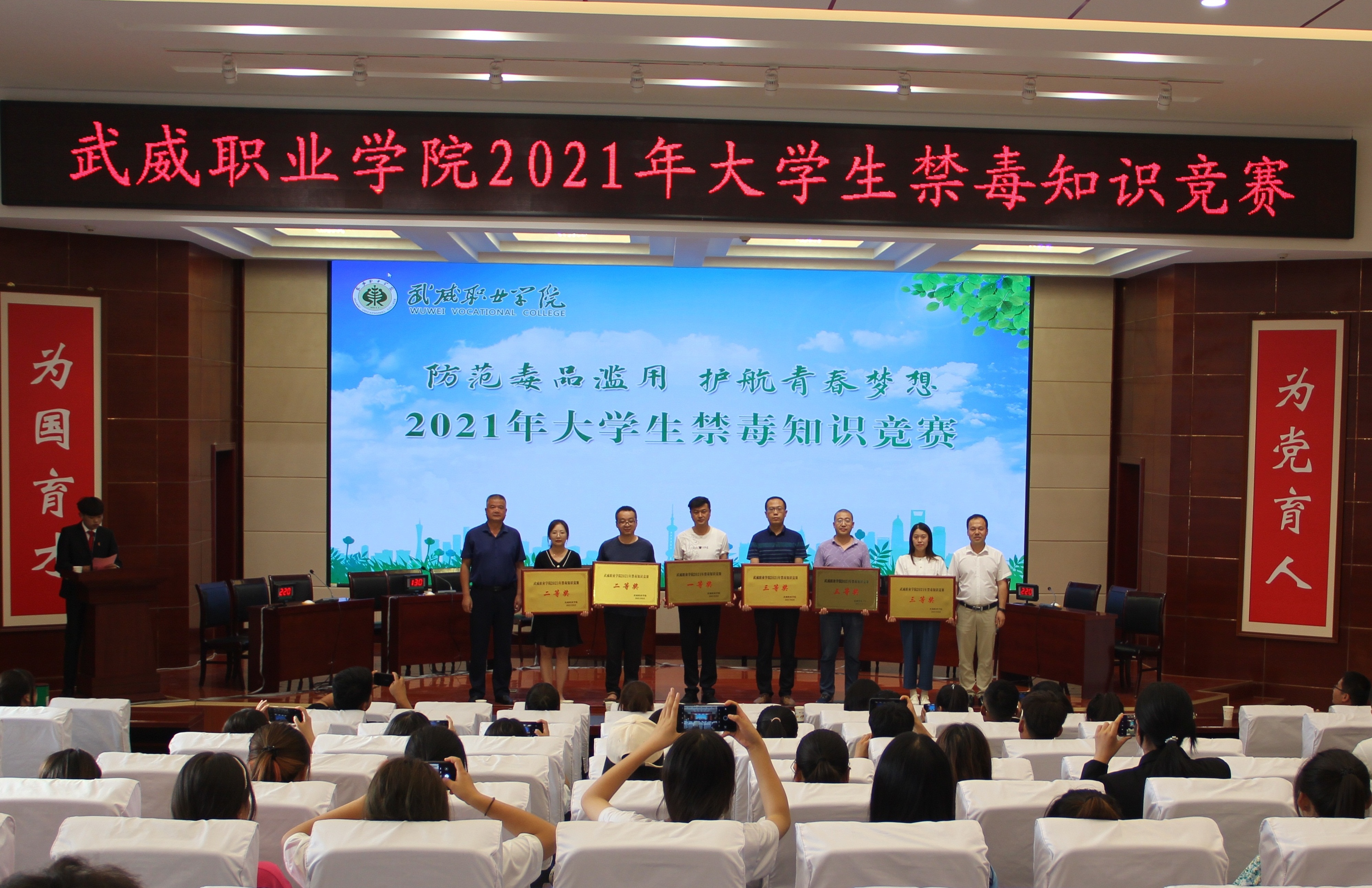 為加強在校大學生禁毒知識普及教育,深入推進青少年毒品預防教育“6.27”工程,7月5日下午,學院在菁英廳舉辦以“防范毒品濫用,護航青春夢想”為主題的2021年大學生禁毒知識競賽決賽。學院黨委委員、副院長王守云出席活動。各教學院系200多名師生觀看了比賽。