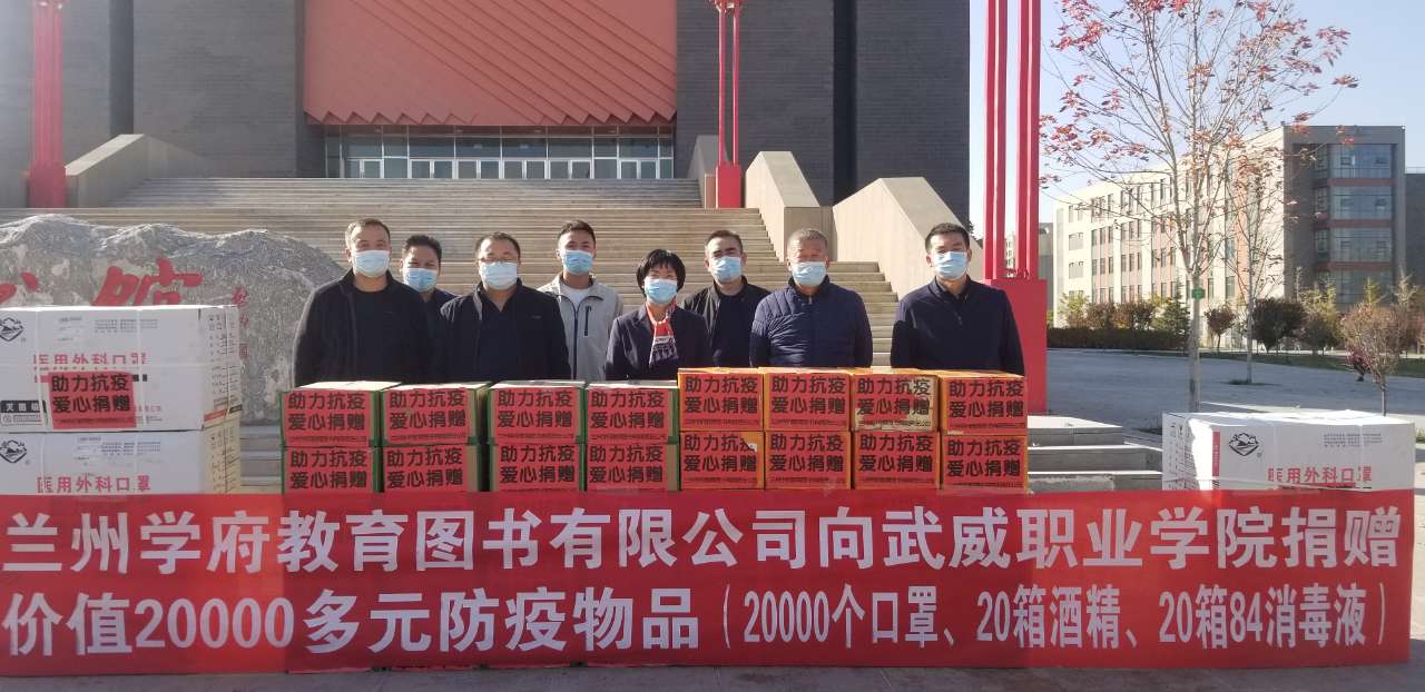 2021年11月4日,武威職業(yè)學(xué)院收到蘭州學(xué)府教育圖書(shū)有限公司捐贈(zèng)的價(jià)值20000多元防疫物品(20000個(gè)口罩、20箱酒精、20箱84消毒液)。學(xué)院黨委委員、副院長(zhǎng)何毅對(duì)蘭州學(xué)府教育圖書(shū)有限公司的慷慨贈(zèng)送表示感謝,對(duì)他們?cè)谖ky面前勇于擔(dān)當(dāng)、鼎力相助的善舉表示贊揚(yáng)。她說(shuō),目前學(xué)校疫情防控在即,消護(hù)物品儲(chǔ)備處于緊張狀態(tài),蘭州學(xué)府教育圖書(shū)有限公司雪中送炭、奉獻(xiàn)愛(ài)心,增強(qiáng)了我們打贏這場(chǎng)疫情防控阻擊戰(zhàn)的信心。