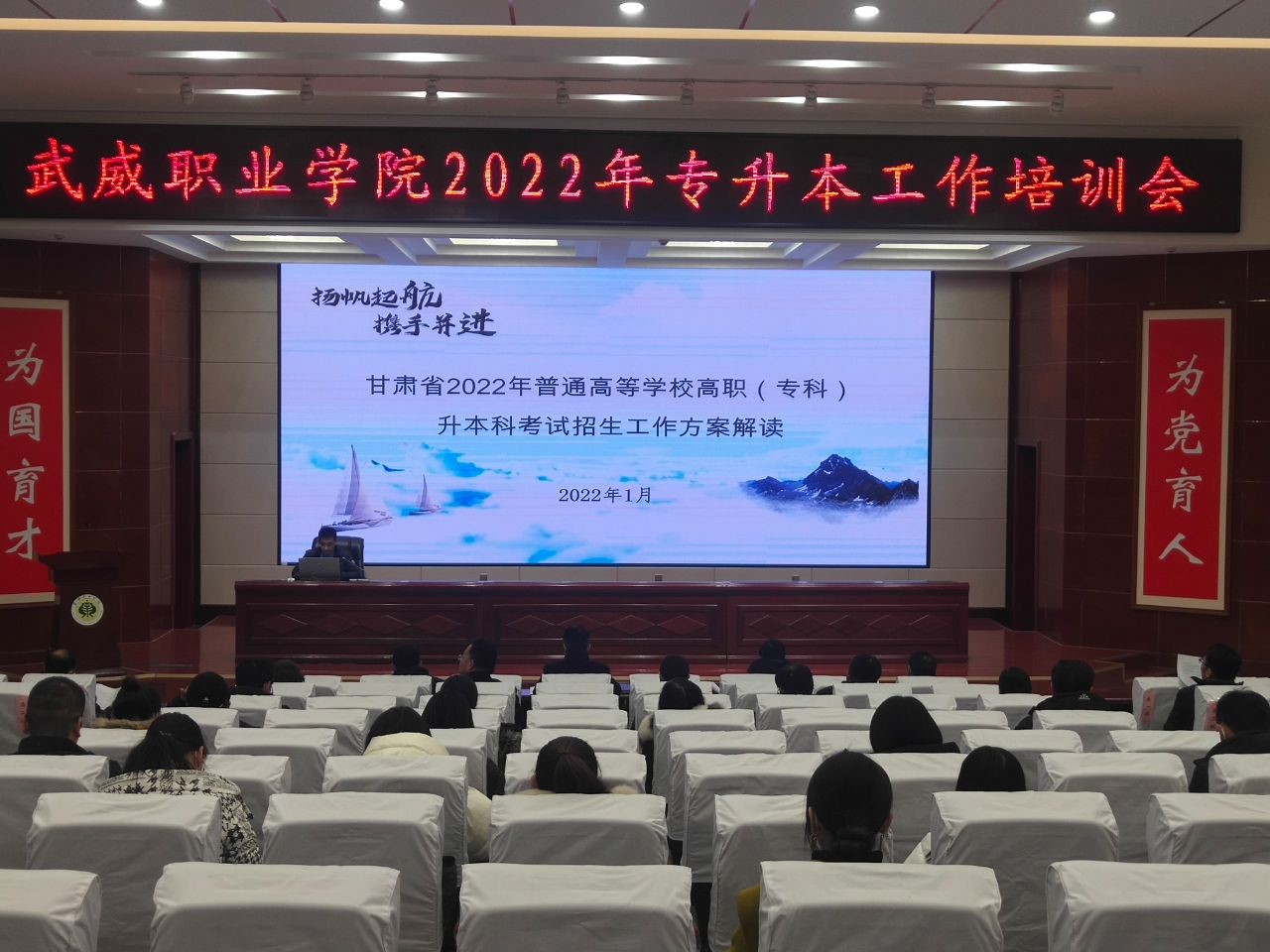 為貫徹落實甘肅省2022年普通專升本考試招生工作部署會會議精神,積極宣傳我省2022年“專升本”招生考試改革政策,引導(dǎo)學院應(yīng)屆畢業(yè)生積極報考“專升本”考試,拓寬畢業(yè)生就業(yè)渠道,實現(xiàn)高質(zhì)量就業(yè)。1月6日,招生就業(yè)處組織召開了學院2022年“專升本”工作培訓(xùn)會。相關(guān)部門負責人、各教學院系書記、主任、輔導(dǎo)員及畢業(yè)班班主任參加了會議。會議由招生就業(yè)處處長蔡柱山主持。
