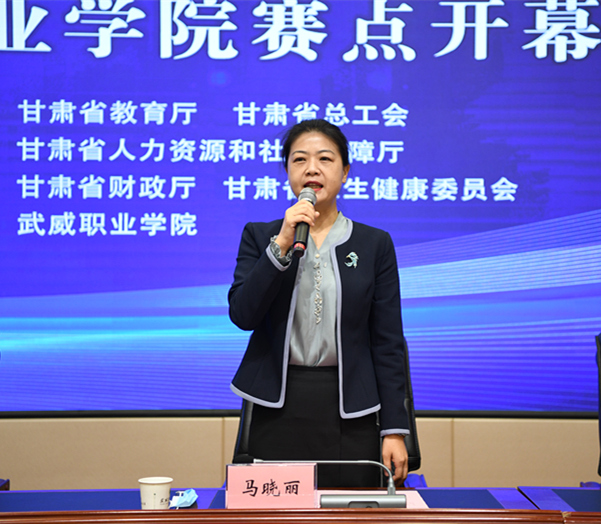 武威市教育局副局長馬曉麗宣布2022年全省職業(yè)院校技能大賽武威職業(yè)學(xué)院賽點(diǎn)開賽。