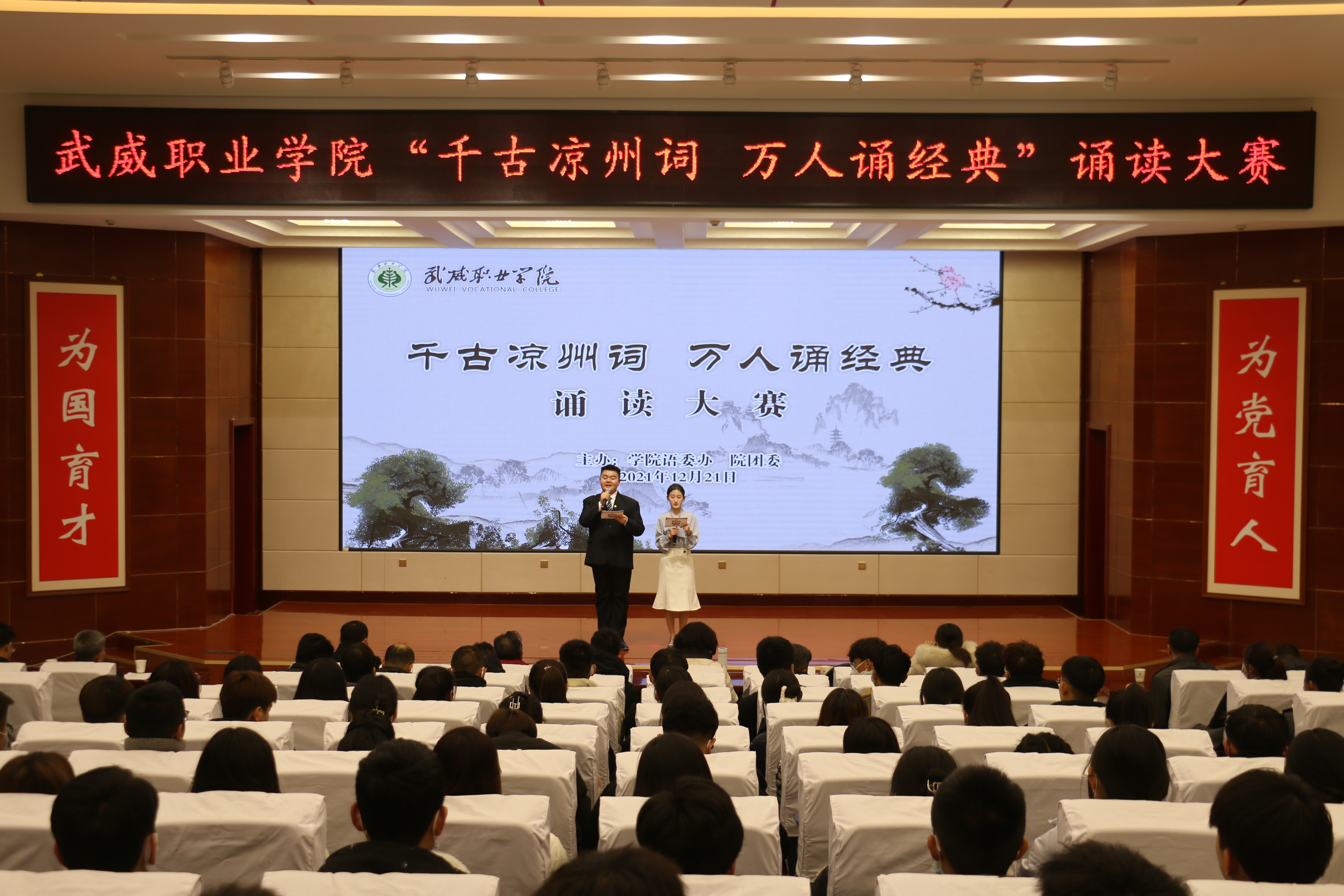 為深化黨史學(xué)習(xí)教育,推進(jìn)“雙高計劃”建設(shè)任務(wù),弘揚涼州文化,傳承絲路精神,助推全國文明城市創(chuàng)建,營造書香校園氛圍,12月21日晚,學(xué)院“千古涼州詞 萬人誦經(jīng)典”誦讀大賽在菁英廳舉辦,學(xué)院黨委書記、院長趙明,黨委委員、副院長張開禮,黨委委員、副院長王守云出席活動,各分團(tuán)委書記及學(xué)生代表250余人觀看比賽。