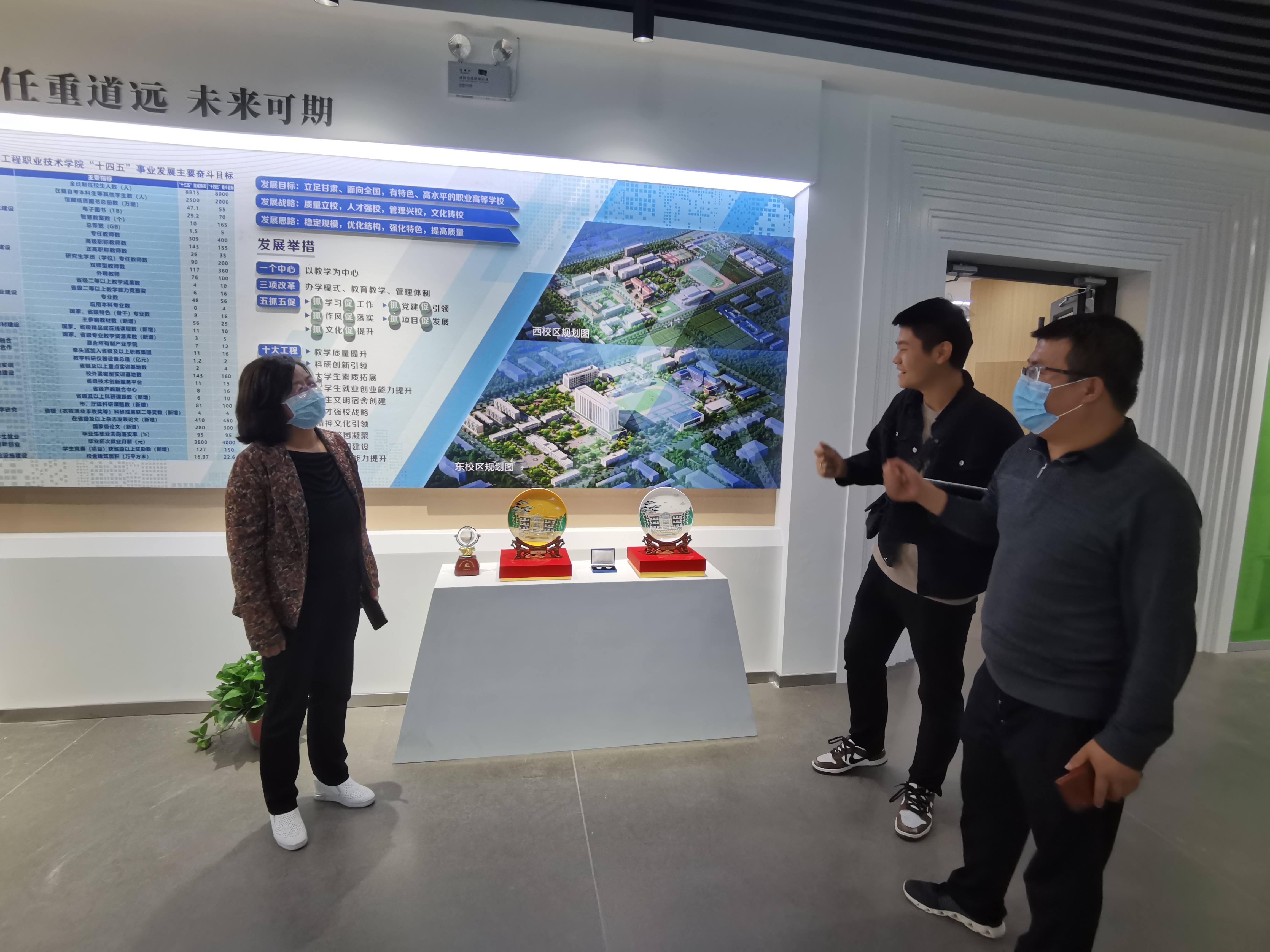 為全面推進(jìn)“雙高計劃”學(xué)校建設(shè),提升圖書館服務(wù)水平,營造“書香校園”,將圖書館打造成人性化、智能化、專業(yè)化的綠色學(xué)習(xí)空間。近日,圖書館館長楊如松、副館長蔡濟(jì)眾、館員楊建盛三人到甘肅省畜牧工程職業(yè)技術(shù)學(xué)院圖書館考察學(xué)習(xí),在甘肅省畜牧工程職業(yè)技術(shù)學(xué)院圖書館館長解玉寶陪同下,參觀了該校圖書館讀書吧、校史館、黨史館、“挑戰(zhàn)杯”獲獎作品展覽館等處,解玉寶講解了該館設(shè)計理念及建設(shè)過程中的側(cè)重點(diǎn)和展示重點(diǎn)。楊如松就現(xiàn)在圖書館裝發(fā)展趨勢、圖書館管理辦法、學(xué)生借閱量等實(shí)際問題同解玉寶進(jìn)行了相互交流。