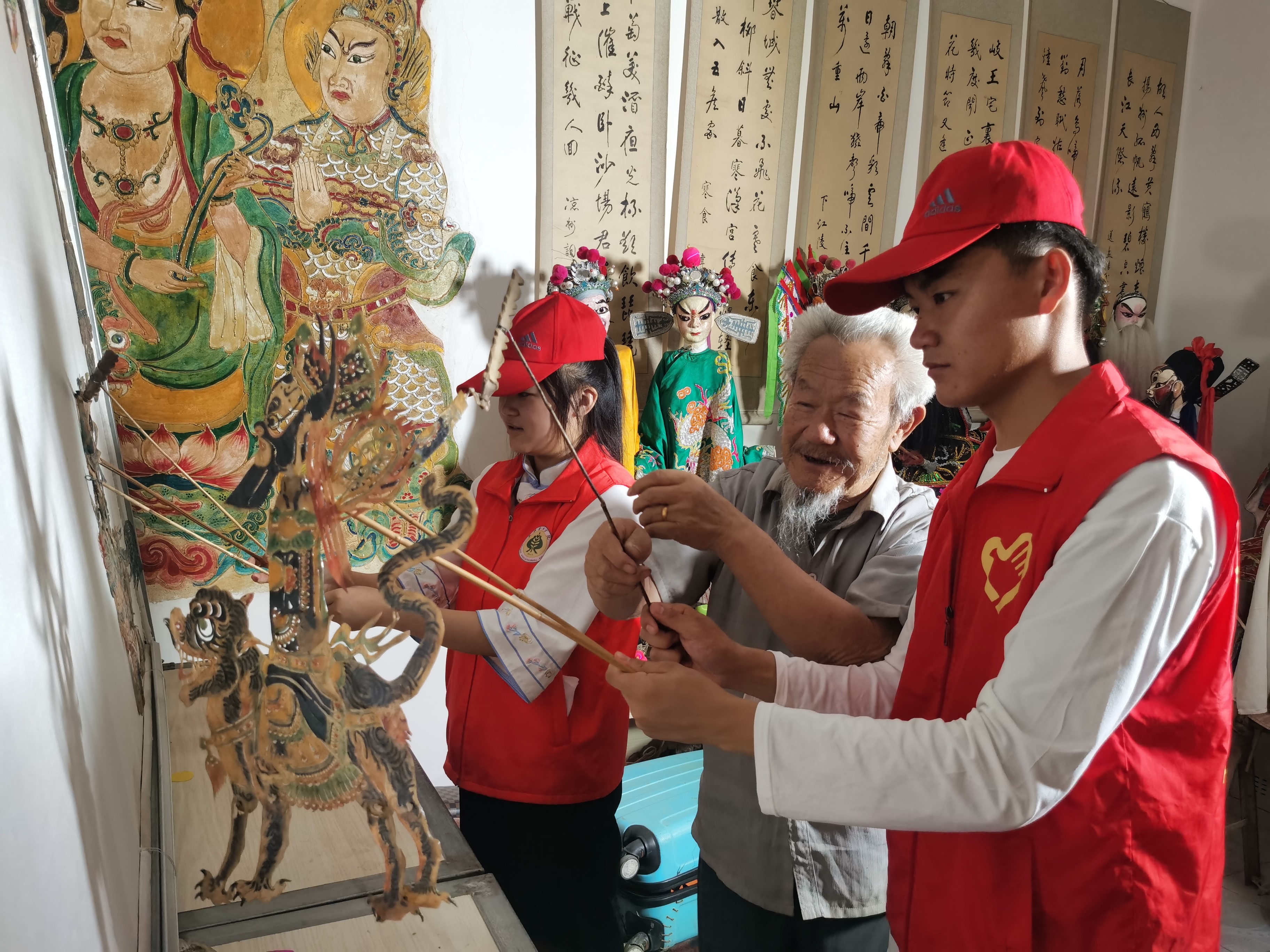 初訪老藝人,馬登岐老人告訴實(shí)踐隊(duì)員,他5歲開(kāi)始就跟著爺爺去十里八鄉(xiāng)唱木偶劇、演皮影戲。沒(méi)想到,這一演就演了86年。家里的400余件木偶、皮影及木偶人物的道具、服裝都是靠自己雕刻、染色、縫制的,制作一個(gè)完整的人物得用一周時(shí)間。如今,他家里還珍藏著明清時(shí)期的皮影和木偶頭像。
