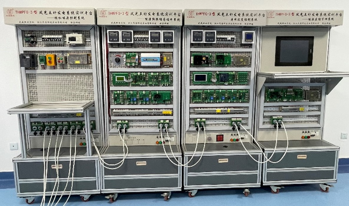 本實(shí)訓(xùn)室擁有風(fēng)光互補(bǔ)發(fā)電實(shí)訓(xùn)系統(tǒng)1套,其主要由光伏供電裝置、光伏供電系統(tǒng)、風(fēng)力供電裝置、風(fēng)力供電系統(tǒng)、模擬能源控制系統(tǒng)、能源轉(zhuǎn)換儲(chǔ)存控制系統(tǒng)、并網(wǎng)逆變控制系統(tǒng)、能源監(jiān)控管理系統(tǒng)組成,各裝置和系統(tǒng)具有獨(dú)立的功能,可以組合成光伏發(fā)電實(shí)訓(xùn)系統(tǒng)、風(fēng)力發(fā)電實(shí)訓(xùn)系統(tǒng)。本實(shí)訓(xùn)室主要服務(wù)于光伏工程技術(shù)及相近專(zhuān)業(yè)開(kāi)設(shè)的光伏發(fā)電技術(shù)分析與應(yīng)用、光伏材料的加工與檢測(cè)、光伏電池的生產(chǎn)加工與維護(hù)、光伏控制器拆裝與維修、光伏器件的組裝與維護(hù)等課程。
