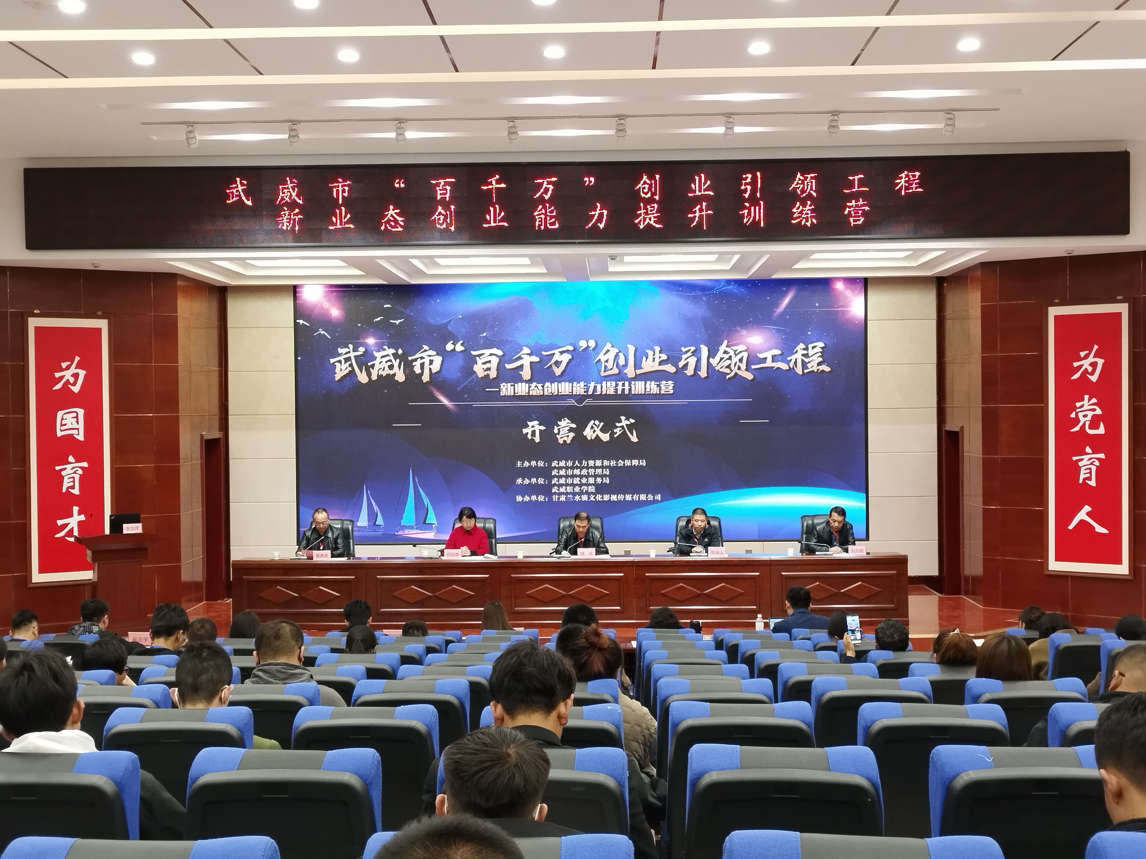 4月6日上午,由我校協(xié)辦的武威市“百千萬”創(chuàng)業(yè)引領(lǐng)工程新業(yè)態(tài)創(chuàng)業(yè)能力提升訓(xùn)練營在菁英廳舉辦開營儀式,武威市人社局黨組成員、就業(yè)局局長魏斌,武威市郵政管理局黨組成員、副局長張金山,武威市就業(yè)局副局長劉兆順及副校長田迎春出席開營儀式,儀式由市就業(yè)局副局長夏湧濤主持。