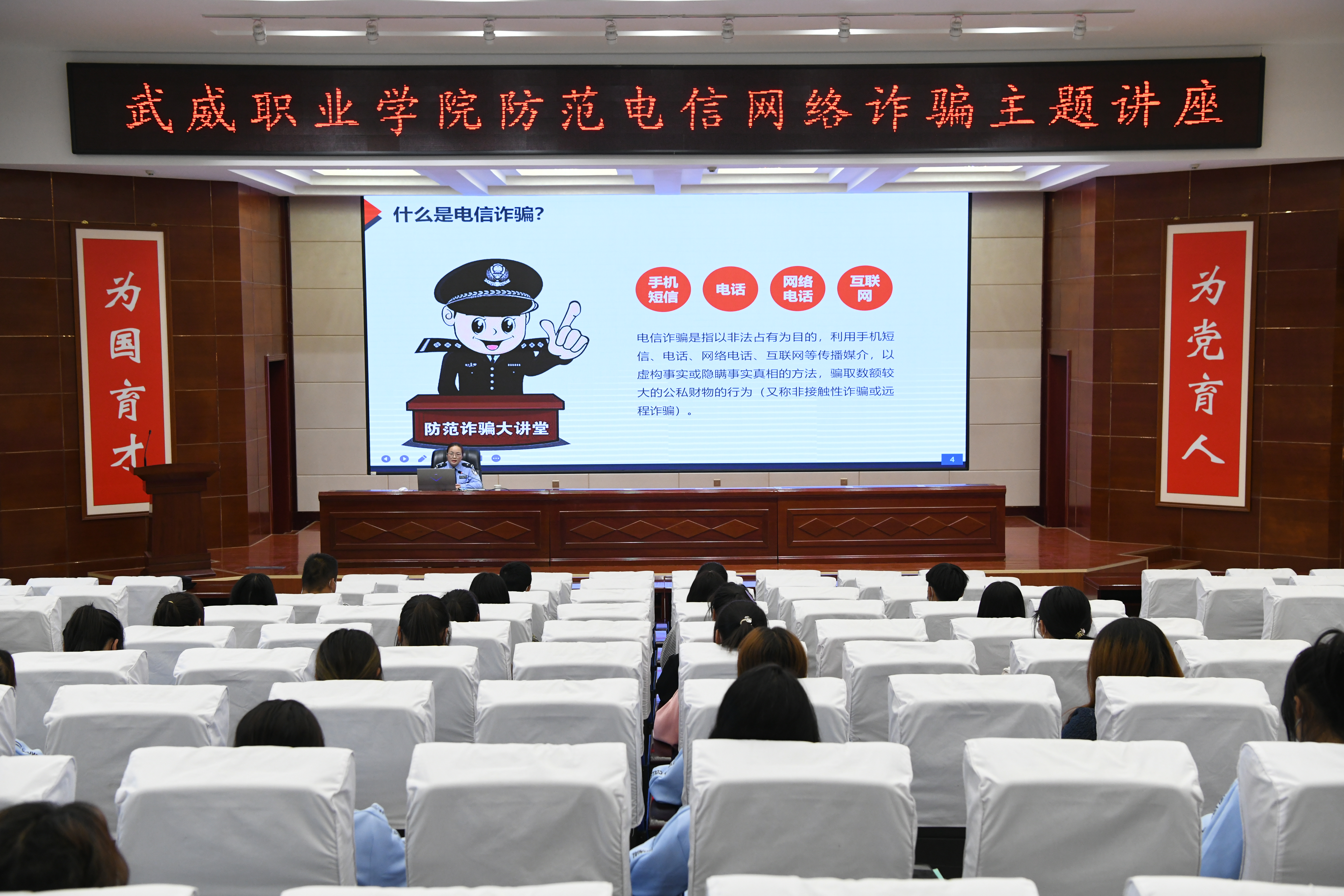 為了提高學校師生識別和防范電信網(wǎng)絡詐騙的能力,切實做好防范電信網(wǎng)絡詐騙宣傳教育工作。9月30日,學校聯(lián)合武威市公安局涼州分局西關派出所在學生發(fā)展中心菁英廳舉辦防范電信網(wǎng)絡詐騙專題講座。各二級學院師生代表聆聽了講座,講座由安全保衛(wèi)處負責人李欣主持。