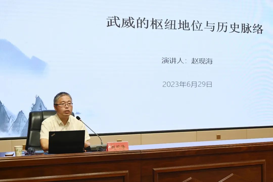 6月29日,2023年第二期《涼州講壇》在武威市開講,中國社會科學院古代史研究所古代通史研究室主任、研究員趙現(xiàn)海應(yīng)邀在武威職業(yè)學院作《武威的樞紐地位與歷史脈絡(luò)》的專題講座。市委宣傳部常務(wù)副部長林艷軍主持。