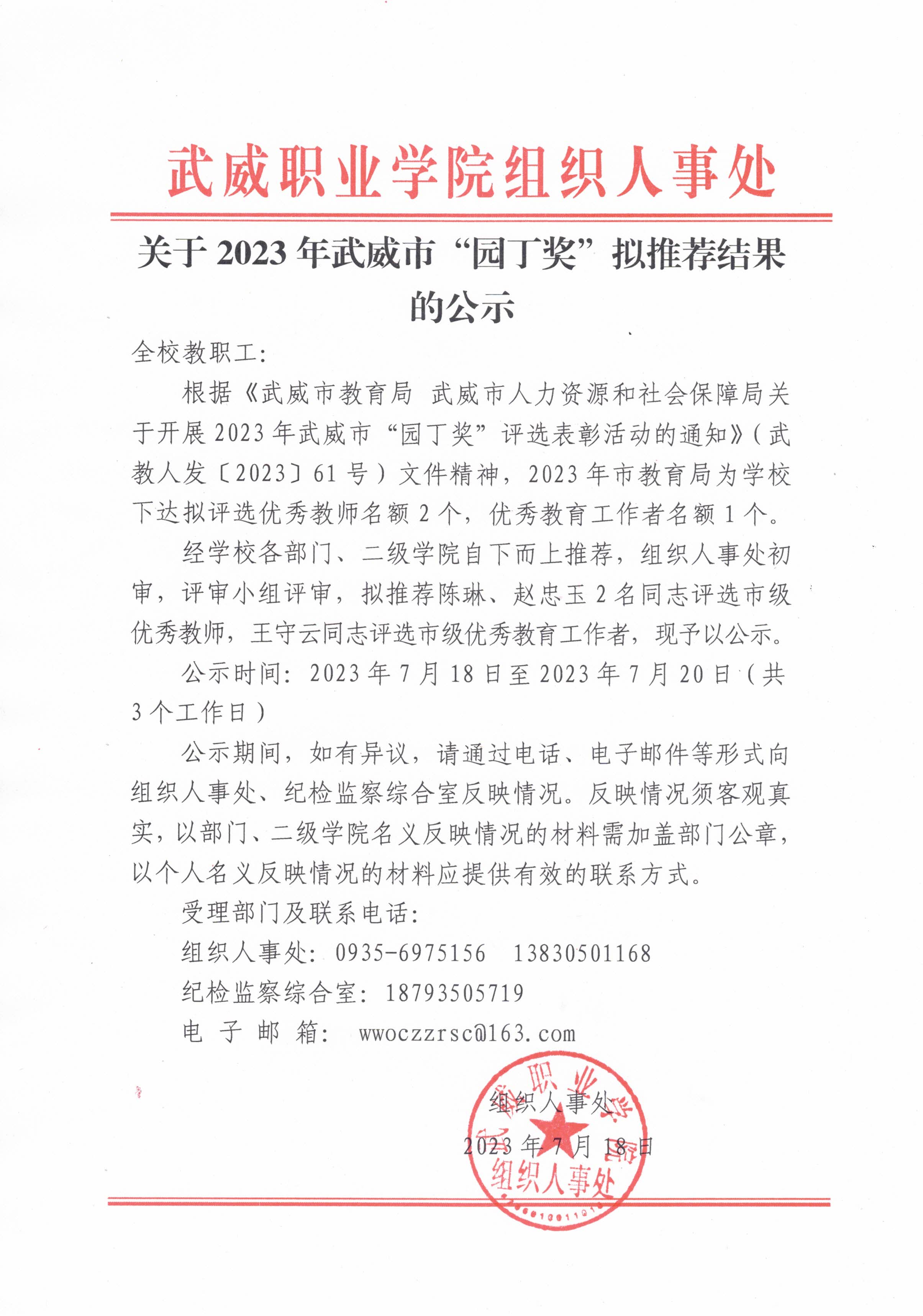 關(guān)于2023年武威市“園丁獎”擬推薦結(jié)果的公示