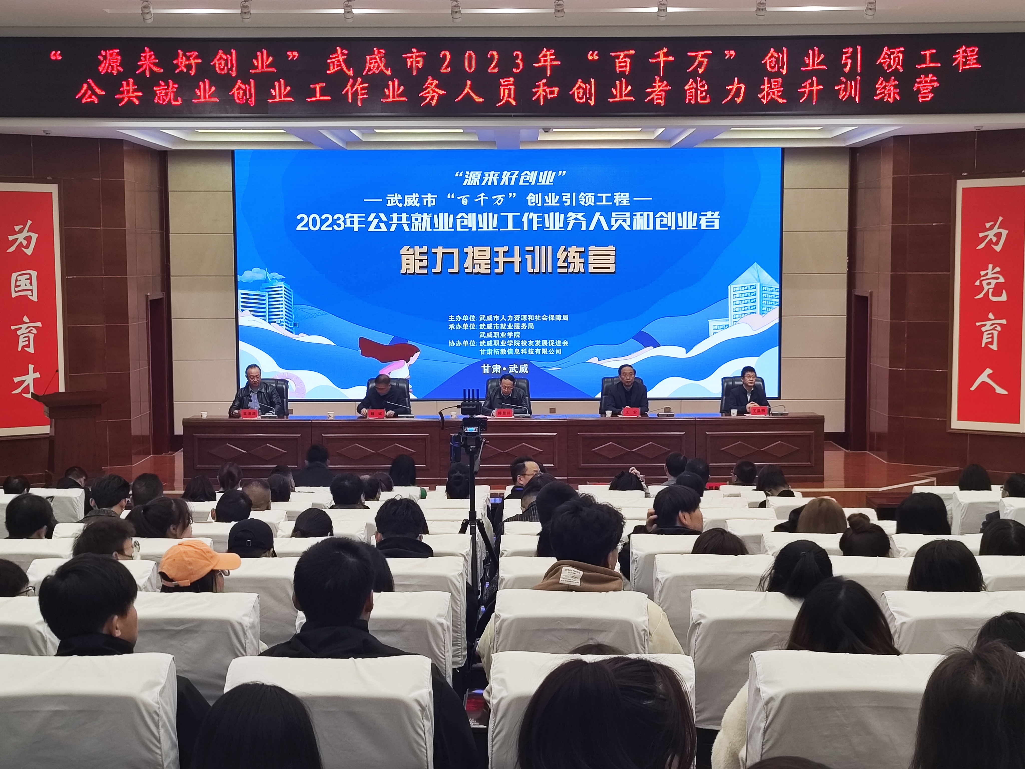 10月24日-26日,由武威市人社局主辦,我校承辦的武威市2023年“百千萬”創(chuàng)業(yè)引領(lǐng)工程就業(yè)創(chuàng)業(yè)能力提升訓(xùn)練營在菁英廳成功舉辦,武威市人社局黨組書記,局長陳昱川,市人社局黨組成員,市就業(yè)局局長魏斌,學(xué)校黨委書記王宏出席了開營儀式。來自縣區(qū)就業(yè)創(chuàng)業(yè)指導(dǎo)中心負(fù)責(zé)人,分管就業(yè)創(chuàng)業(yè)工作的領(lǐng)導(dǎo),就業(yè)創(chuàng)業(yè)工作業(yè)務(wù)骨干,我校學(xué)生代表共200人參加訓(xùn)練營活動。