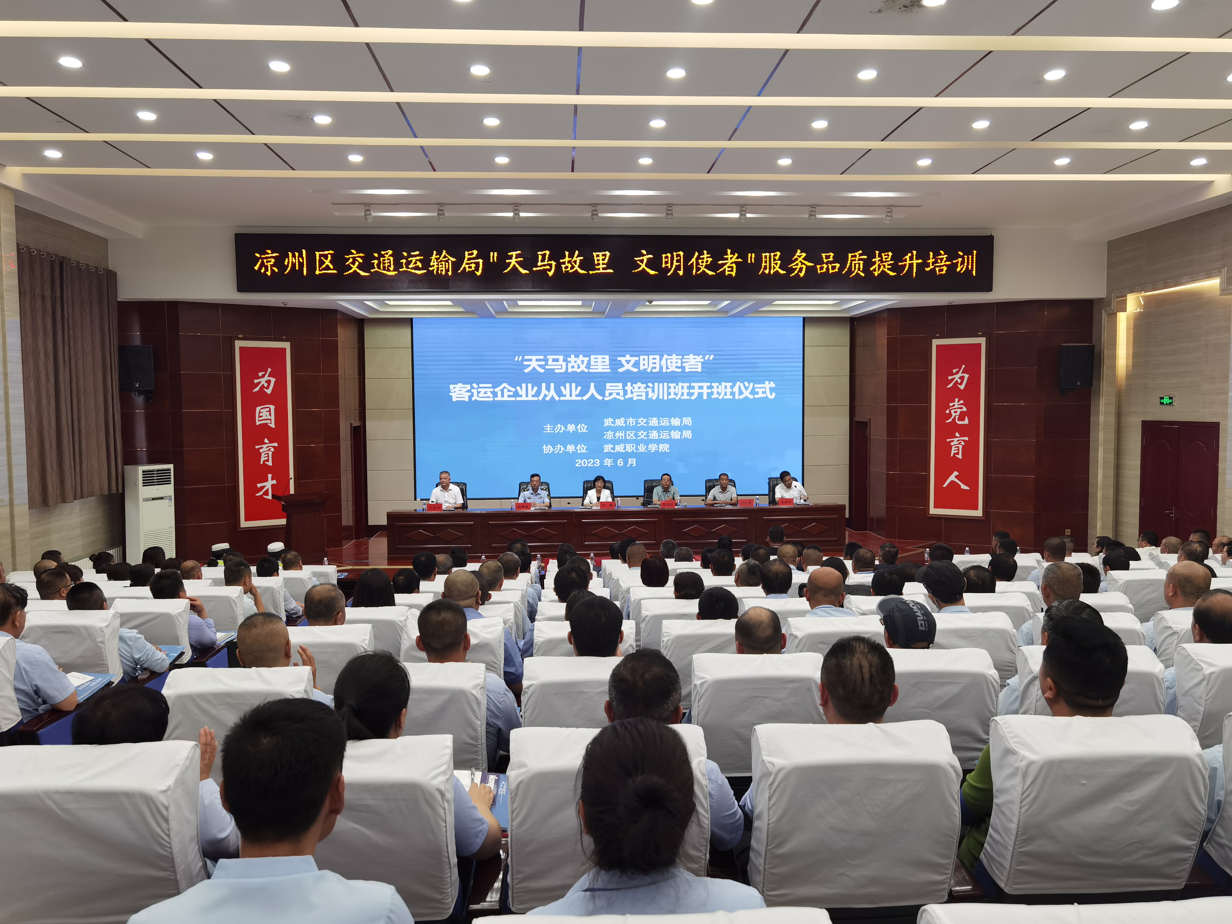 6月28日,“天馬故里 文明使者”客運企業(yè)從業(yè)人員服務品質提升培訓班在武威職業(yè)學院開班。市交通局副局長柴天祥,區(qū)委常委、統(tǒng)戰(zhàn)部部長、區(qū)政協(xié)黨組書記許娜,市交通運輸綜合行政執(zhí)法隊隊長韓世泰,市運管局副局長許培明,學校黨委委員、副校長王守云出席開班儀式。開班式由涼州區(qū)交通運輸局副局長蘇銀堂主持,出租客運公司、城市公交公司和定制客運公司管理人員及從業(yè)人員220人參加開班儀式。