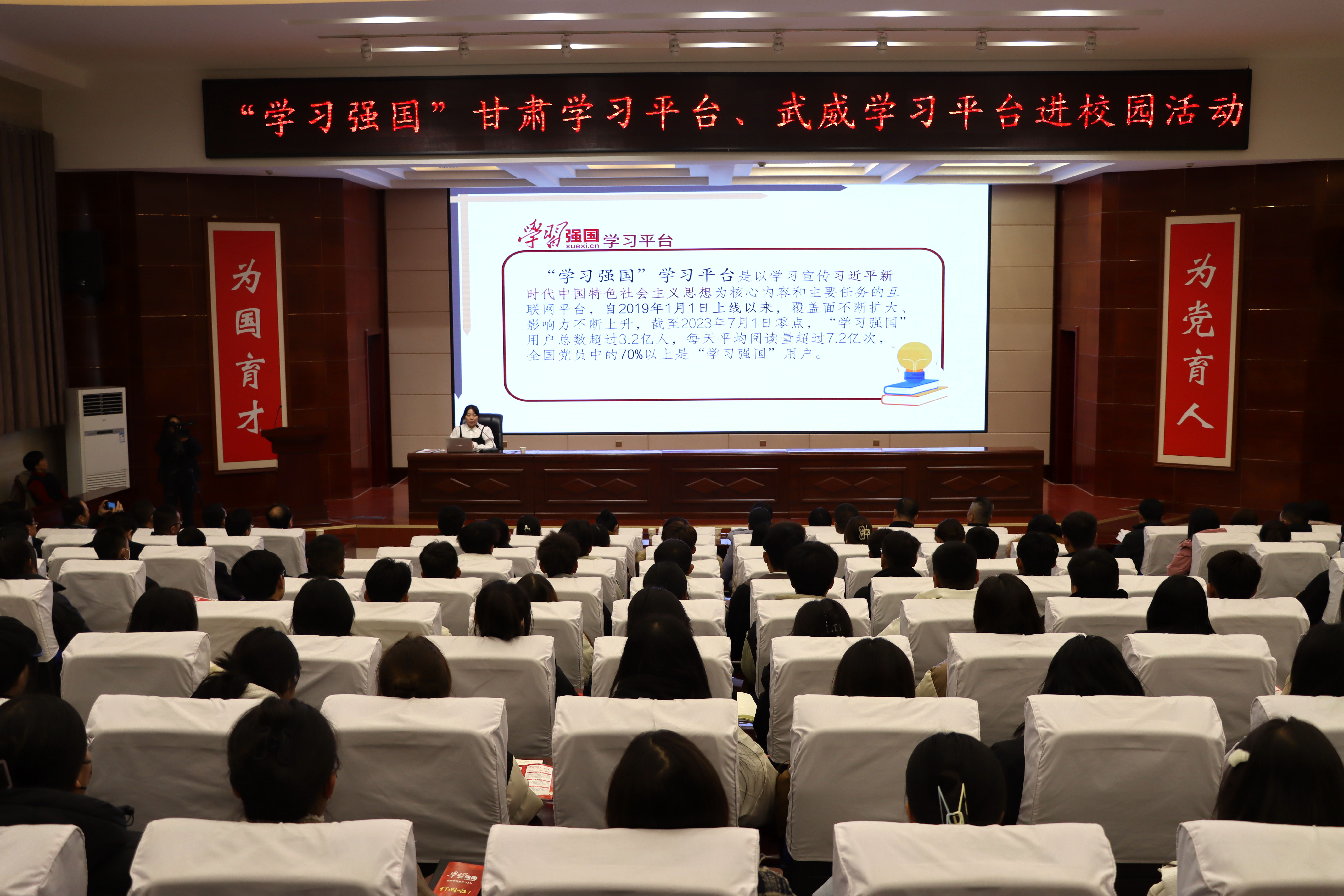 11月28日下午,“學習強國”甘肅學習平臺、武威學習平臺進校園活動在學校菁英廳舉辦,省委講師團副團長張啟曄、市委講師團團長蔡生菊出席了活動,活動由學校黨委委員、副校長何毅主持。
