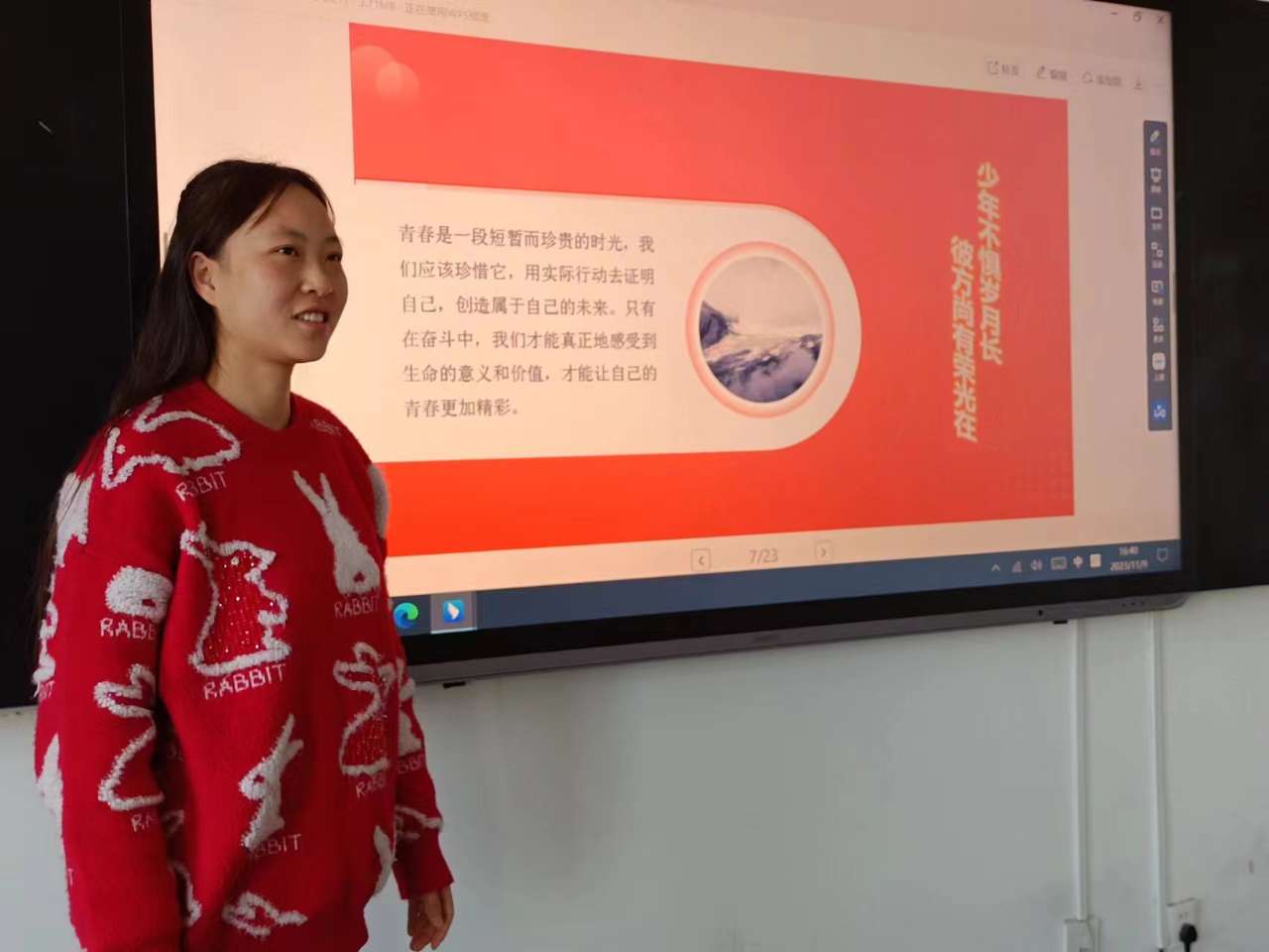 藝術(shù)與教育學(xué)院2021級學(xué)生后麗婷分享了自己參加“三下鄉(xiāng)”社會實(shí)踐服務(wù)團(tuán)隊(duì),走進(jìn)基層社區(qū)開展志愿服務(wù)活動(dòng),在基層體悟中不斷增強(qiáng)責(zé)任感和使命感,在社會課堂中“受教育、長才干、作貢獻(xiàn)”的事跡。她期盼各位學(xué)子做新時(shí)代好青年,如螢火一般,有一分熱便發(fā)一分光,以奮斗來點(diǎn)亮青春最亮麗的底色。