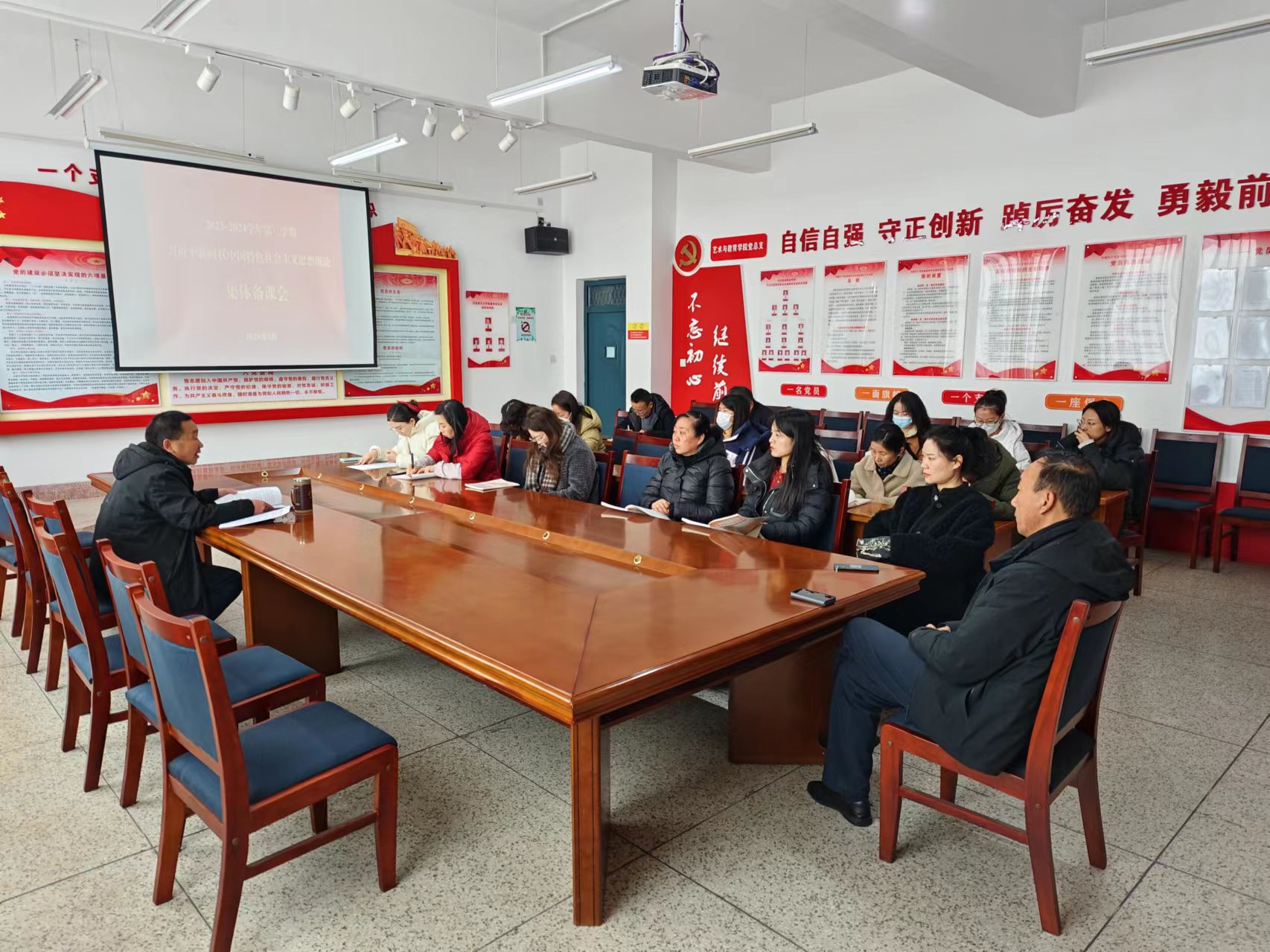 為全面、準(zhǔn)確把握《習(xí)近平新時(shí)代中國(guó)特色社會(huì)主義思想概論》教材的重點(diǎn)和難點(diǎn),堅(jiān)持用黨的創(chuàng)新理論鑄魂育人,推動(dòng)思政課教學(xué)提質(zhì)增效,3月4日,馬克思主義學(xué)院召開《習(xí)近平新時(shí)代中國(guó)特色社會(huì)主義思想概論》課程集體備課會(huì)。會(huì)議由習(xí)近平新時(shí)代中國(guó)特色社會(huì)主義思想概論教研室主任魏玲主持,全體教師參加會(huì)議。