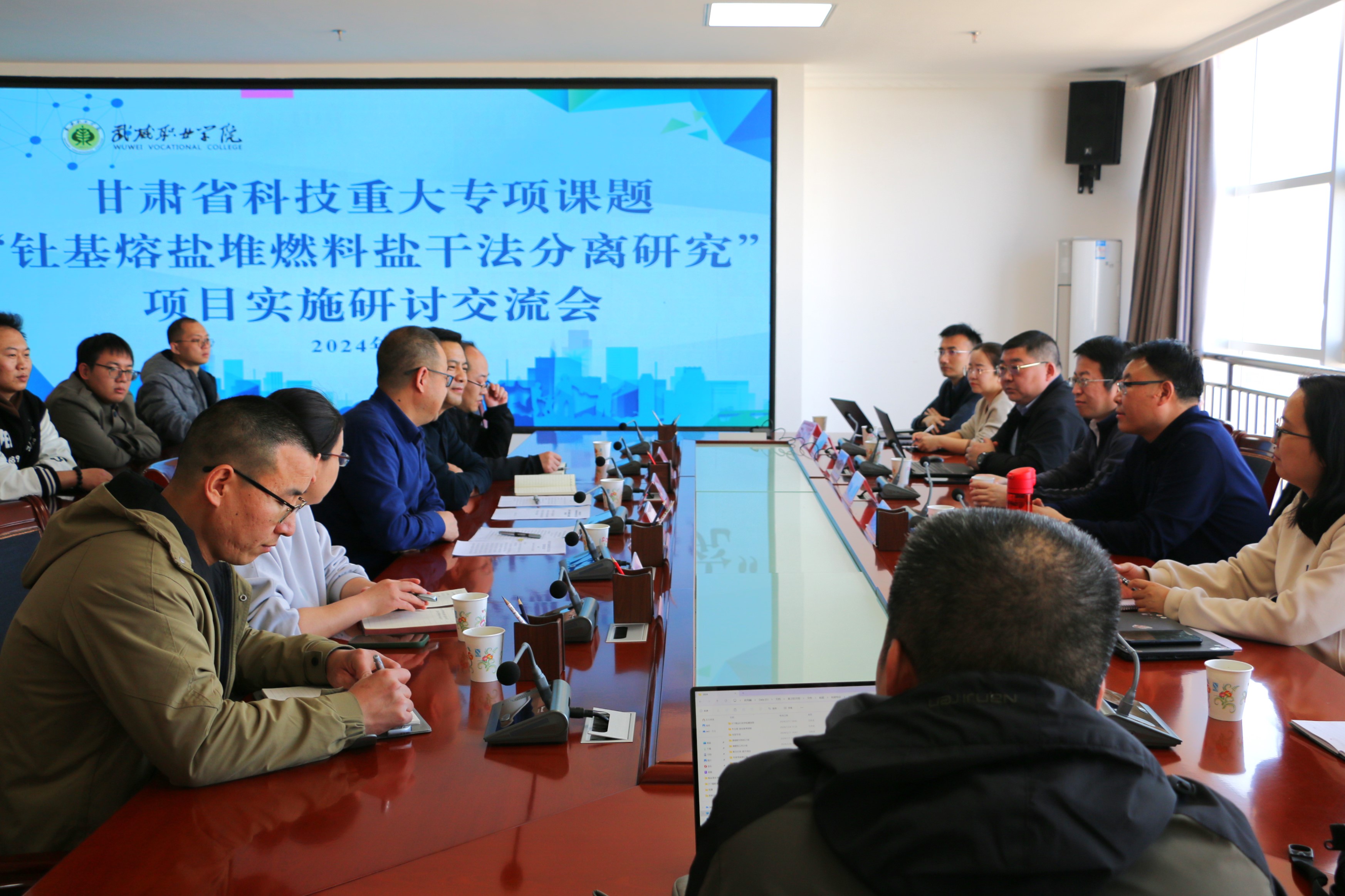 2024年3月11日,甘肅省科技重大專項課題“釷基熔鹽堆燃料鹽干法分離研究”項目實施研討交流會在武威職業(yè)學院能源科技樓811舉行。中科武威新能源研究所主任趙先堂,中國科學院上海應用物理研究所主任龔昱一行15人,武威職業(yè)學院黨委副書記翟存祥出席此次會議。項目骨干、武威職業(yè)學院教師代表約50人參加此次會議。會議由中科低碳新能源技術(shù)學院副院長黃述杰主持。