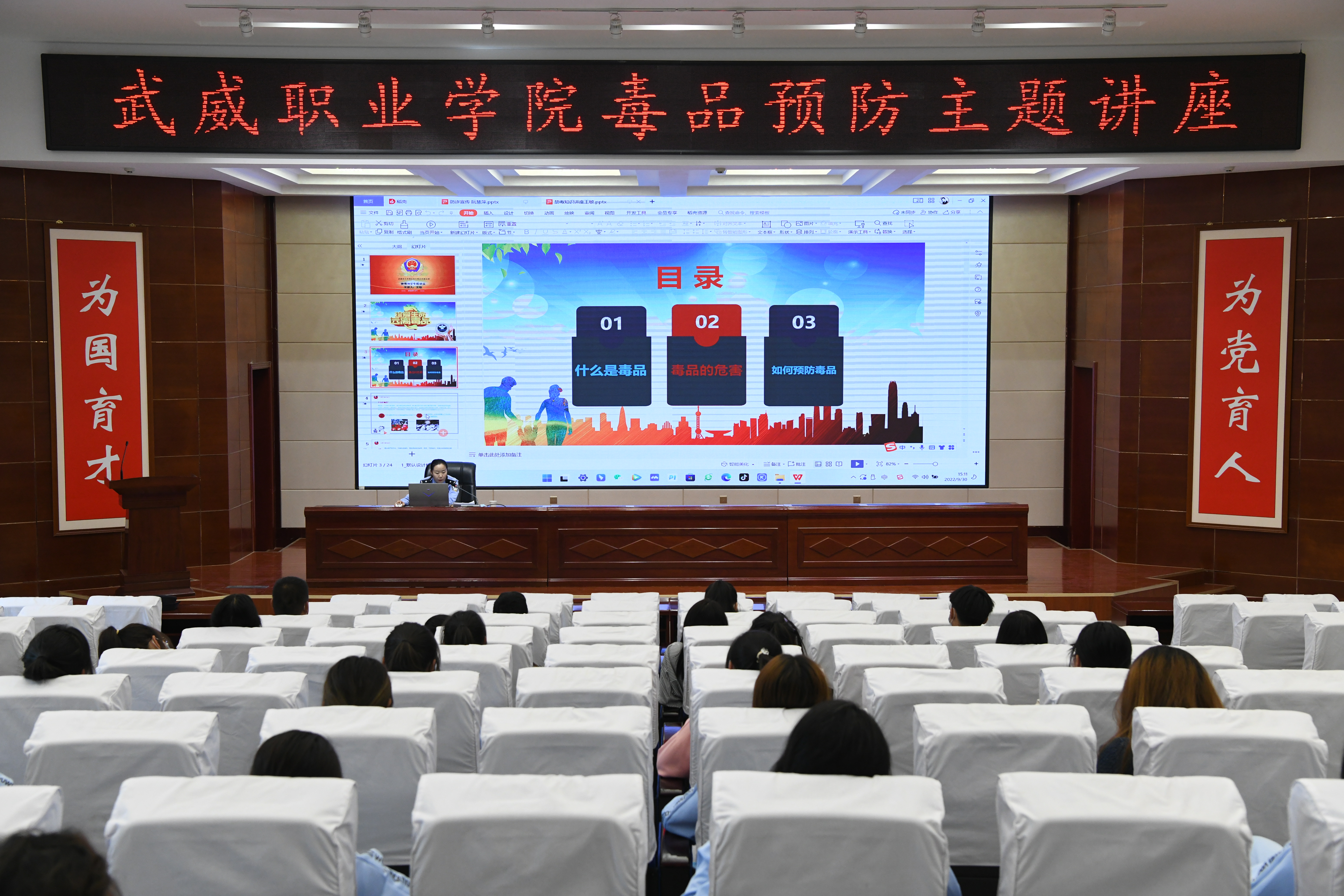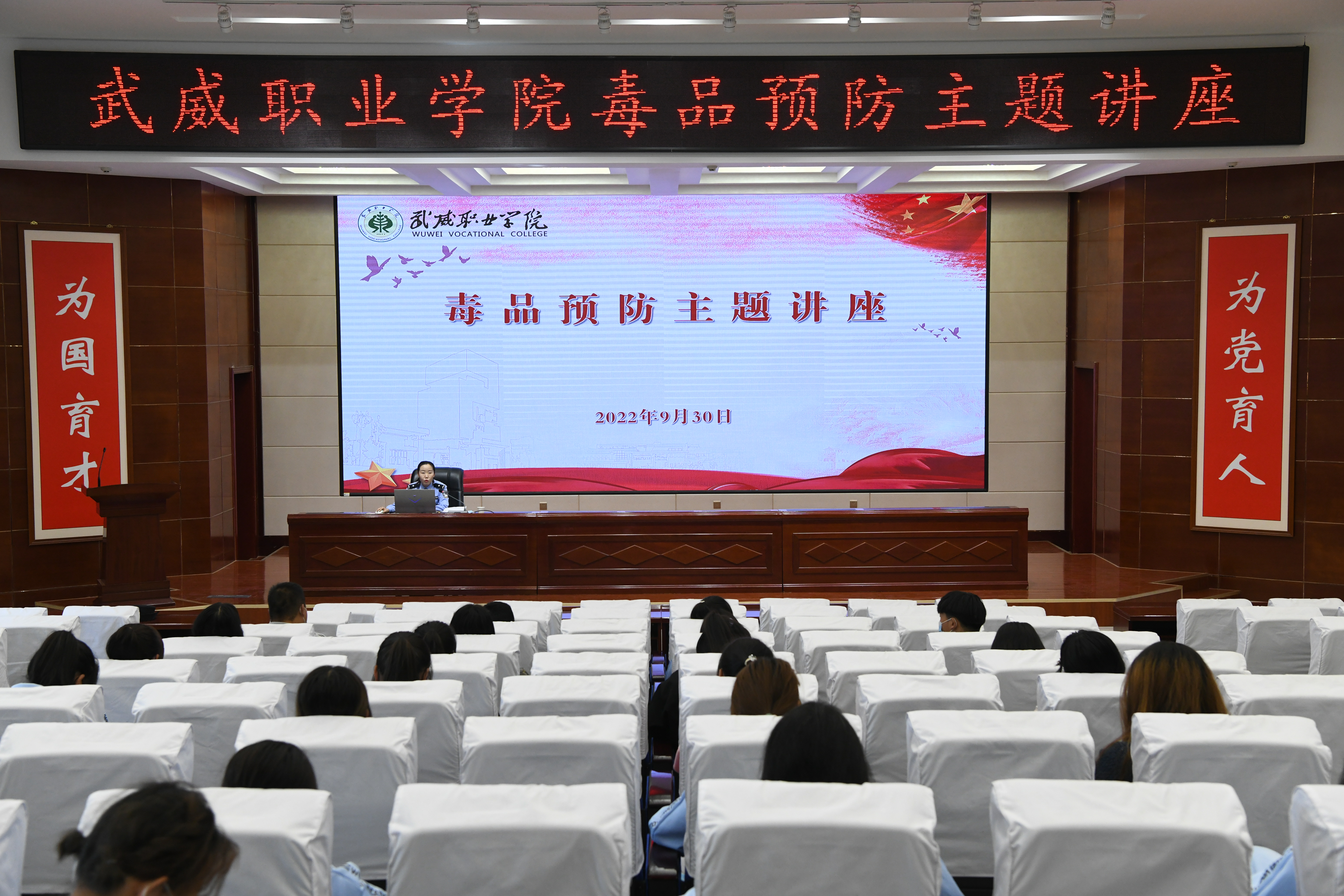 為進(jìn)一步加強(qiáng)學(xué)校毒品預(yù)防教育工作,不斷提高師生識(shí)毒、防毒、拒毒意識(shí),9月30日,學(xué)校安全保衛(wèi)處邀請(qǐng)武威市公安局涼州分局西關(guān)派出所民警王敏同志在學(xué)生發(fā)展中心菁英廳開(kāi)展“健康人生 綠色無(wú)毒”預(yù)防毒品主題講座,各二級(jí)學(xué)院師生代表聆聽(tīng)了講座,講座由安全保衛(wèi)處負(fù)責(zé)人李欣主持。