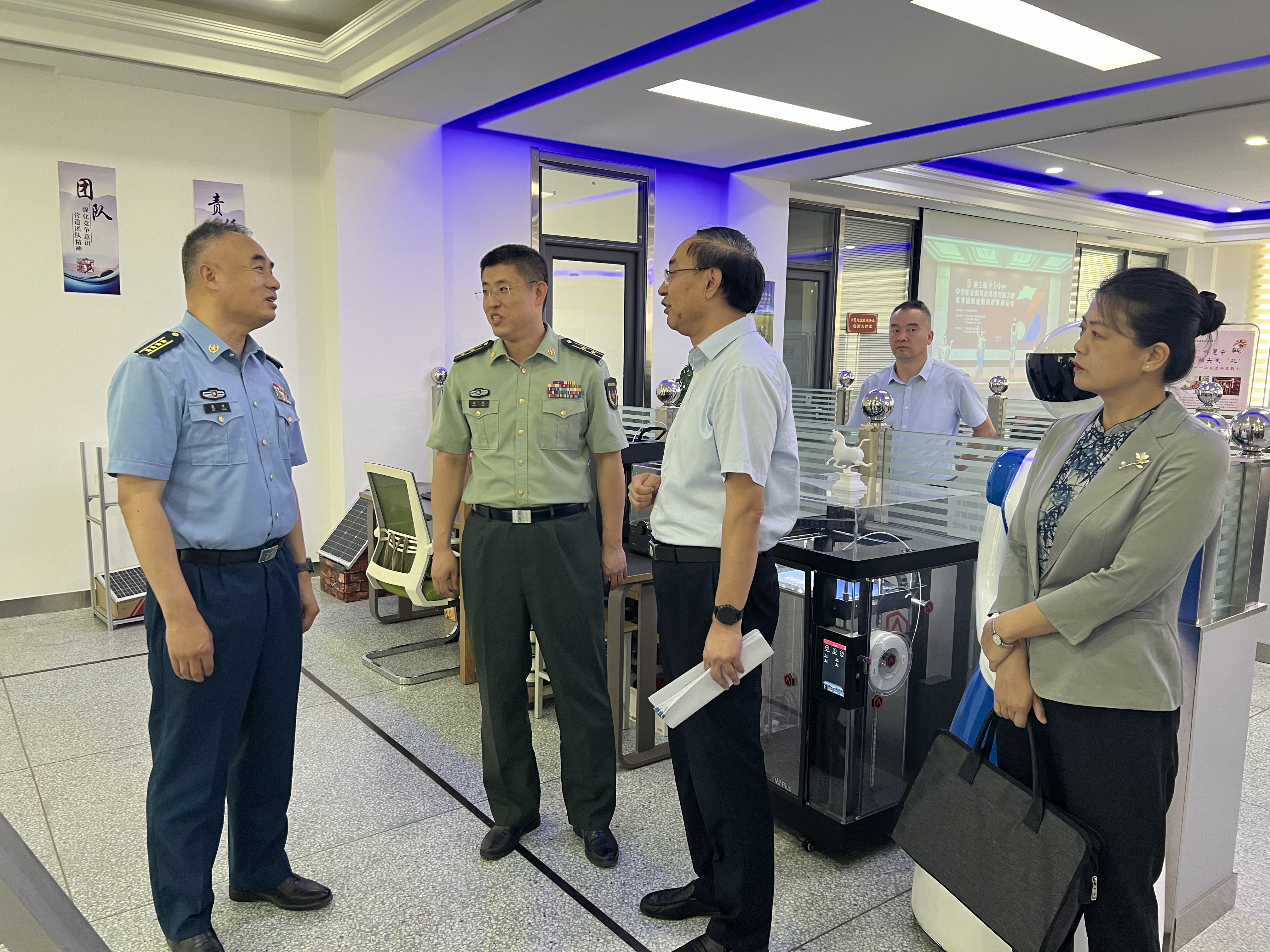 工作組一行參觀了學(xué)校征兵工作站,查看了近年來征兵工作相關(guān)資料,并參觀了學(xué)校創(chuàng)新創(chuàng)業(yè)學(xué)院、體育場(chǎng)和工程技術(shù)學(xué)院智能制造實(shí)訓(xùn)中心。參觀結(jié)束后,在學(xué)校能源樓一樓會(huì)議室向工作組匯報(bào)了學(xué)校貫徹落實(shí)《兵役法》的具體措施,取得的成效以及下一步打算。工作組對(duì)學(xué)校黨委領(lǐng)導(dǎo)重視貫徹落實(shí)《兵役法》和征兵工作給予高度肯定!對(duì)學(xué)校近兩年超額完成征兵任務(wù)表示衷心感謝!希望學(xué)校繼續(xù)做好兵役征集工作,為部隊(duì)輸送高質(zhì)量的優(yōu)秀兵源。
